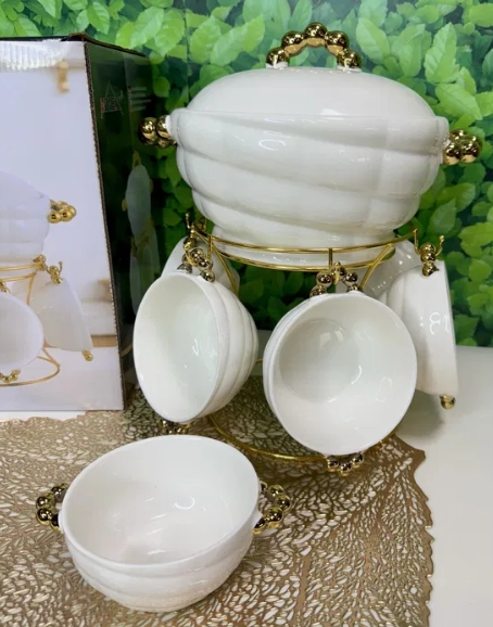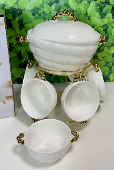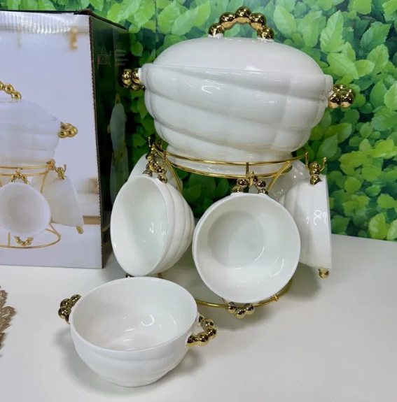 Komplekts ir radīts jūsu ērtībai. Liela zupas bļoda ar skaistu vāku ilgstoši saglabās ēdiena siltumu, un ērtie rokturi ļaus to viegli un droši pārnest. Viss glīti ievietojas speciālā metāla statīvā, kas ne tikai ietaupa vietu uz galda, bet arī izskatās īpaši estētiski.