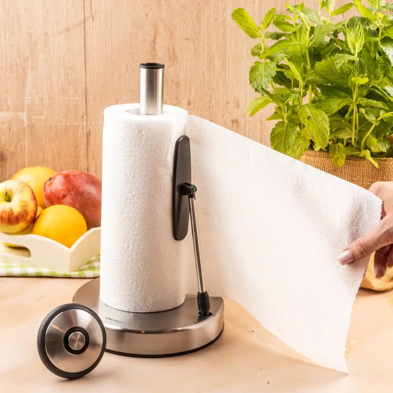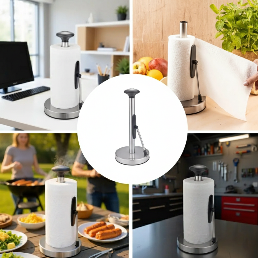 Statīvs paredzēts standarta papīra dvieļu ruļļu turēšanai. Piemērots lietošanai virtuvē, birojā, darbnīcā vai ārā grilējot.