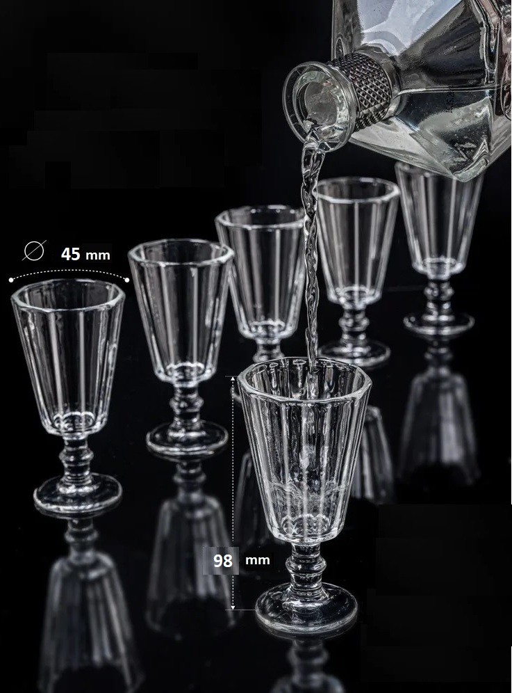 Glāzīšu dizains izceļas ar stingrām, vertikālām līnijām, kas piešķir ģeometrisku stingrību un eleganci. Smalki dekorētā kājiņa ne tikai rotā, bet arī ļauj ērti turēt glāzīti, nesildot dzērienu. Stabilā, smagākā pamatne nodrošina, ka glāzīte stingri stāvēs uz galda. 40 ml tilpums tiek uzskatīts par klasisku un ideālu vienam degvīna malkam, kā to prasa senās tradīcijas.