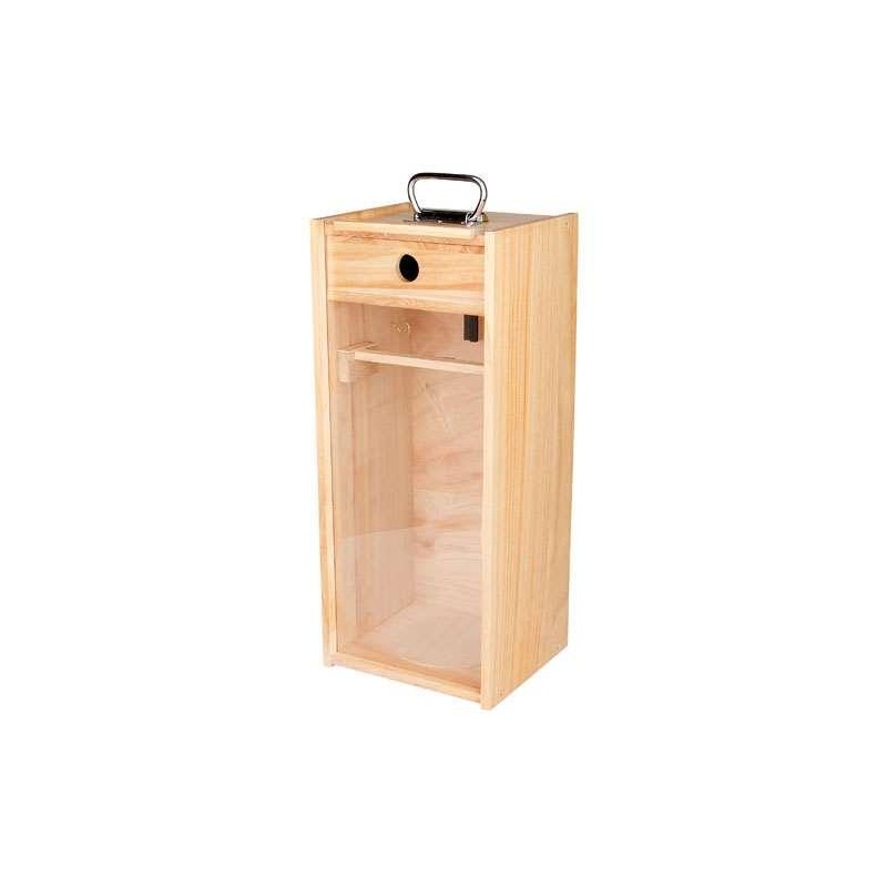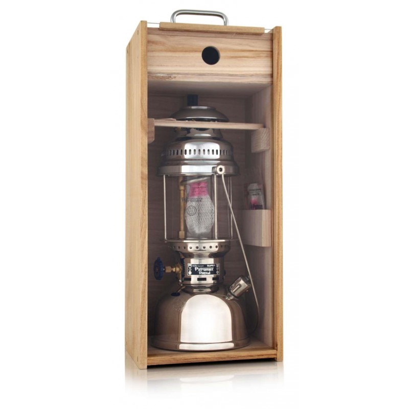 Koka kastīte ar organiskā stikla priekšpusi ir roku darbs. Lakotais koks ir viegls, bet ļoti izturīgs un pasargā no putekļiem vai netīrumiem. Kastītes augšpusē atradīsiet atvilktni, kurā varat uzglabāt dažādus piederumus vai rezerves daļas. Stiprs rokturis nodrošina drošu pārnēsāšanu. Kastīte patiesi ir elegantākais veids, kā transportēt, prezentēt vai uzglabāt savu Petromax lampu.