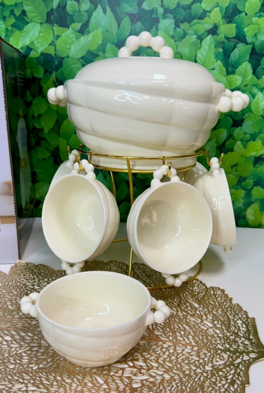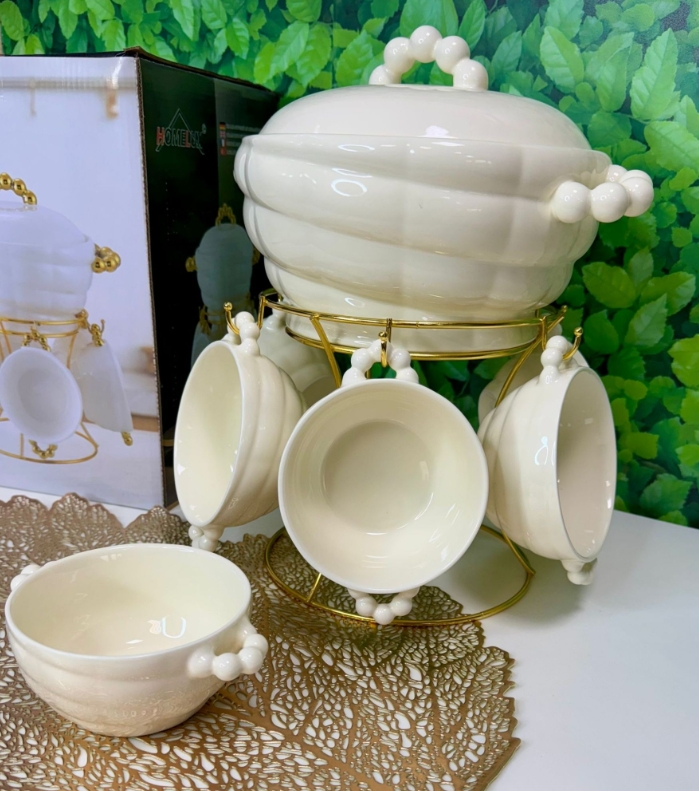 - ✅ Pilns komplekts: Zupas bļoda, 6 bļodiņas un elegants zelta krāsas statīvs.