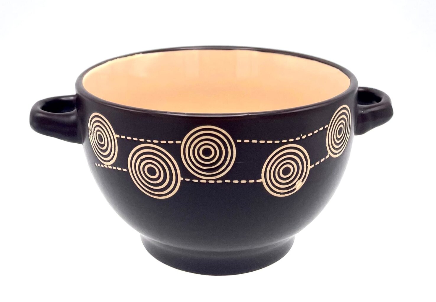 - Estētika: Tumši brūna ārpuse, rotāta ar stilizētiem spirālveida apļiem, skaisti kontrastē ar gaišu krēmkrāsas iekšpusi, piešķirot traukam mājīgumu un siltumu.