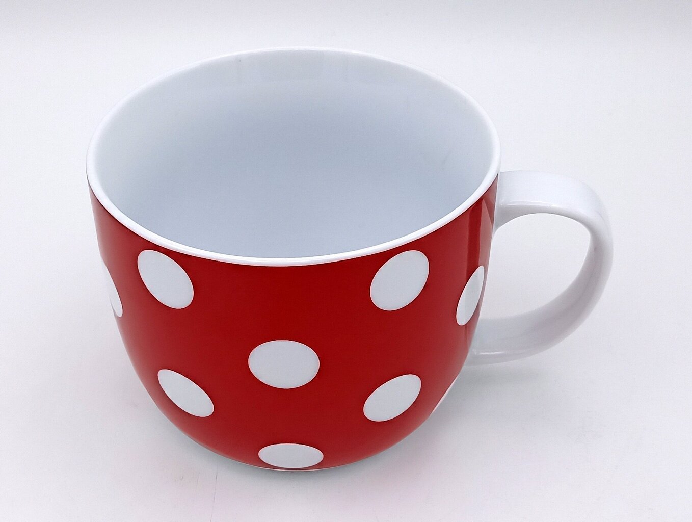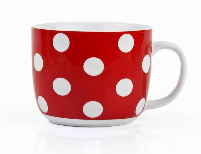 - Dizains: Spilgti sarkanā krūzes virsma, kas nosēta ar baltiem punktiem, rada rotaļīgu un nostalģisku retro stilu. Iekšpuse atstāta tīri balta, kas piešķir krūzei higiēnisku un estētisku kontrastu.