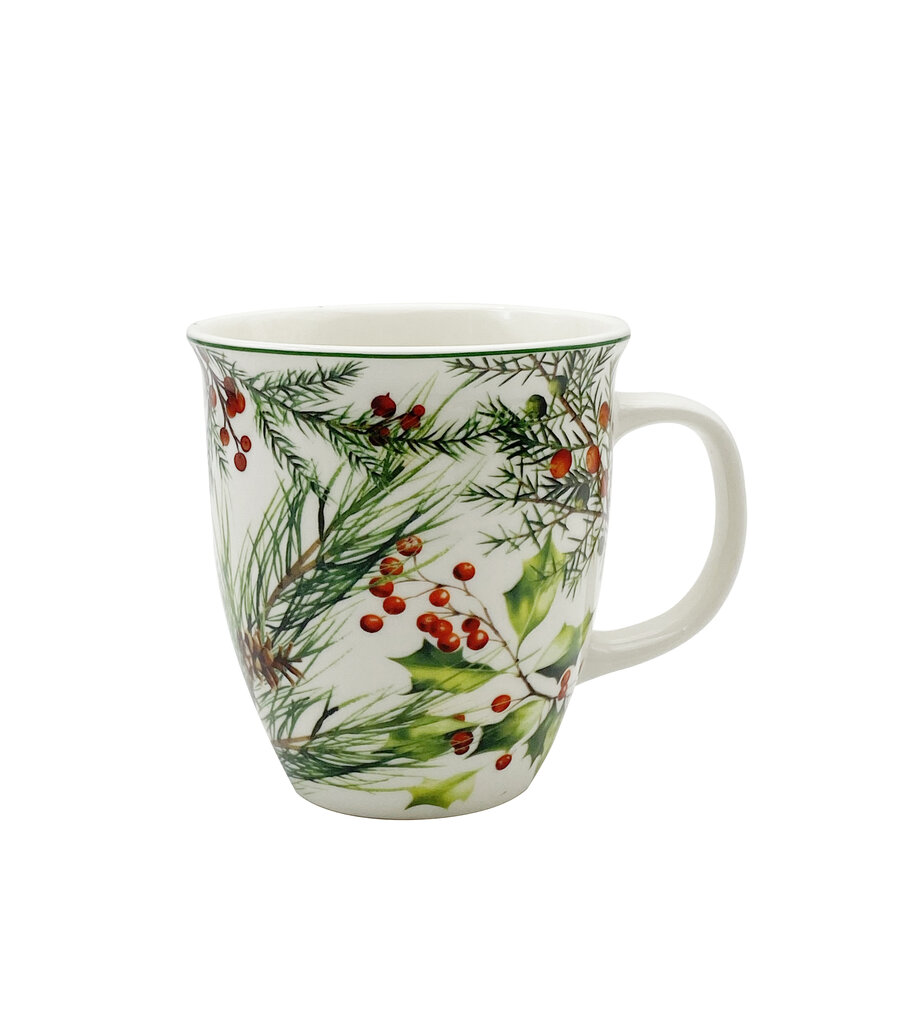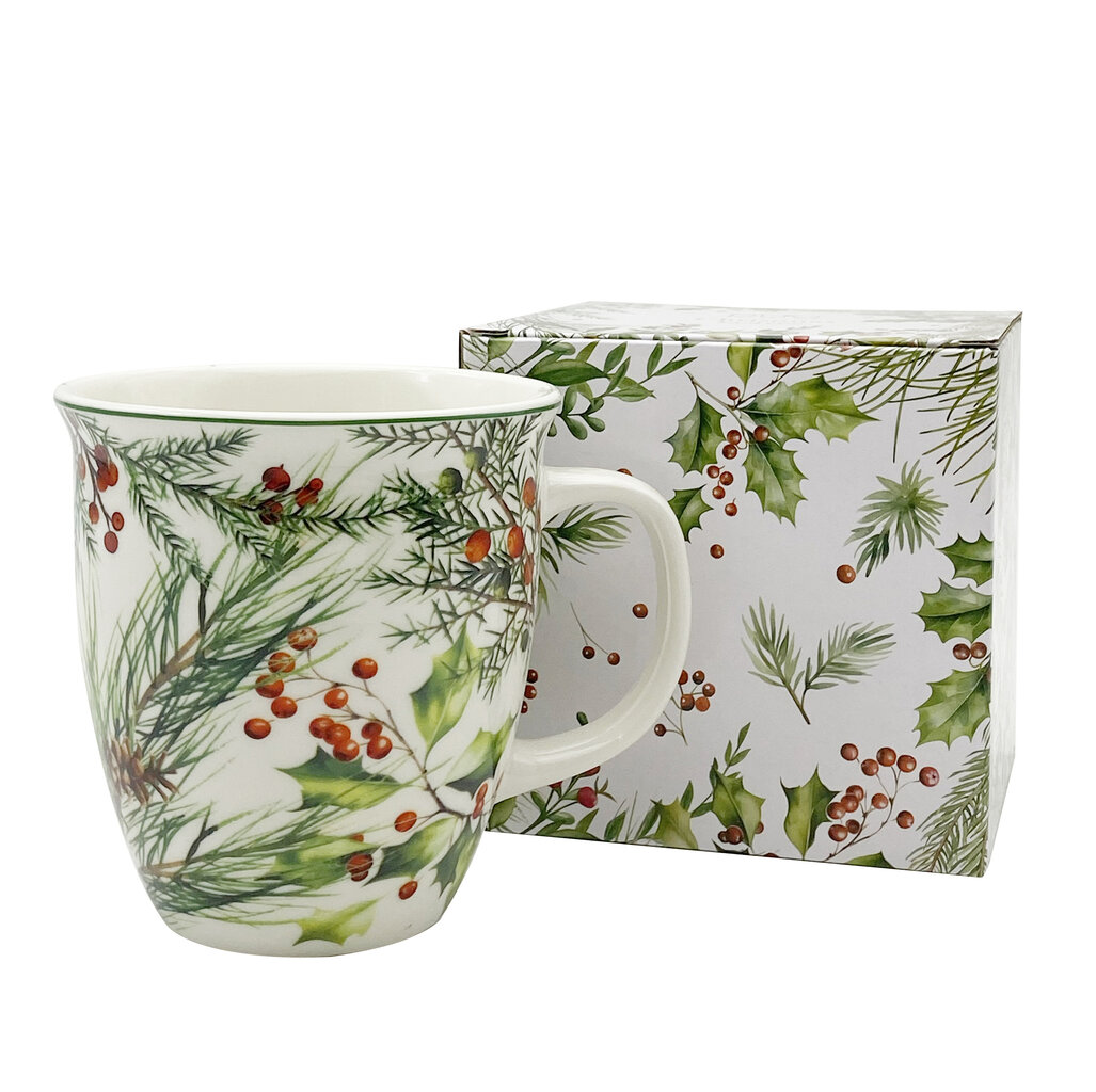 - Ziemīgs dizains: Krūzi rotā spilgts un dabisks raksts: savijušies zaļi eglītes un akmeņozola zari ar sarkanām ogām. Tas rada svinīgu, mežu elpojošu atmosfēru.