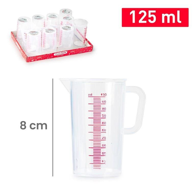 Šī kompaktā 125 ml “PlasticForte” mērkrūze ir neaizstājams palīgs, kad nepieciešama augsta precizitāte. Ražota Spānijā, tā apvieno funkcionalitāti un izturību, tāpēc lieliski piemērota gan virtuves eksperimentiem, gan sadzīves vajadzībām.