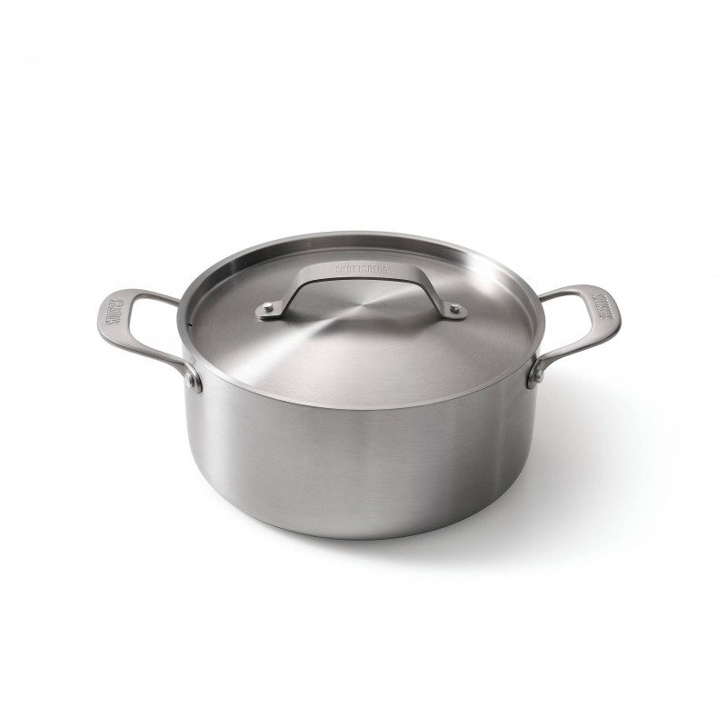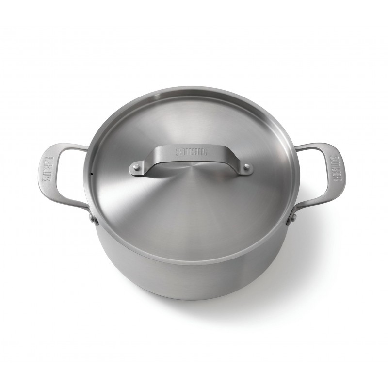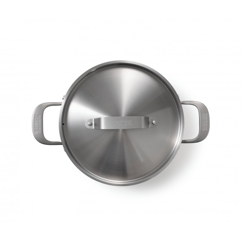 Skottsberg 24 cm, 4,75L nerūsējošā tērauda katls ar vāku – tas ir trauks, kas paredzēts ilgstošai lietošanai bez sintētiskiem pārklājumiem. Alumīnija serde starp 18/0 ārējiem un 18/10 iekšējiem tērauda slāņiem nodrošina ātru un vienmērīgu siltuma sadali, tādējādi ēdieni nepārkarst un nepiedeg.