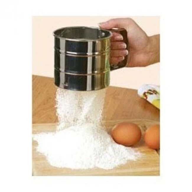 Šī nerūsējošā tērauda krūze-siets ir neaizstājams rīks katra cepēja virtuvē. Atšķirībā no tradicionālajiem sietiem, šis modelis ļauj sijāt miltus ar vienu roku, neizkaisot tos uz galda virsmas, bet tieši bļodā.