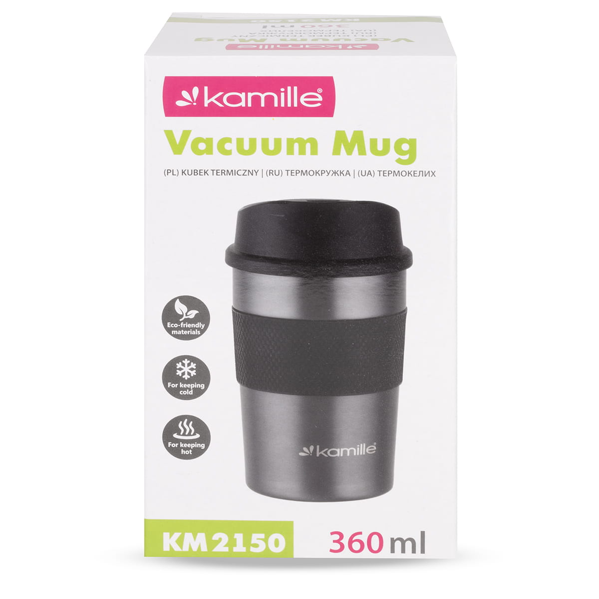 - Praktisks dizains: Korpuss ir pārklāts ar neslīdošu termoplastiskas gumijas slāni, kas nodrošina stingru satvērienu. Kompaktais izmērs ļauj krūzei viegli ievietoties automašīnas krūžu turētājā vai nelielā mugursomā.