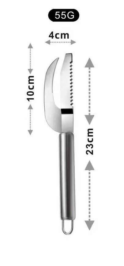 - Iekšējo orgānu izņemšana: Īpašā izliektā asmens forma (loka veida atvere) ļauj viegli un precīzi atvērt zivs vēderu un izņemt iekšējos orgānus ar vienu kustību.