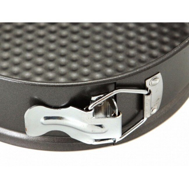 - Noņemama konstrukcija: Formai ir uzticama sprādze, kas ļauj atvērt sānu gredzenu un droši izņemt izcepto torti vai pīrāgu, nesabojājot tā malas.