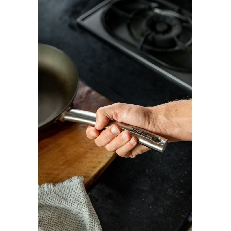 SKOTTSBERG® oglekļa tērauda panna ir novērtēta tās daudzo īpašo īpašību dēļ. Panna ir iepriekš pārklāta ar augu eļļu, kas nodrošina, ka tā viegli nepiedeg. Turklāt pannas dibens ir 2,5 mm biezs, lai karsēšanas laikā tas nedeformētos. Pannas rokturis ir dobjš, tāpēc tas neuzsūc siltumu no pannas un nesakarst.