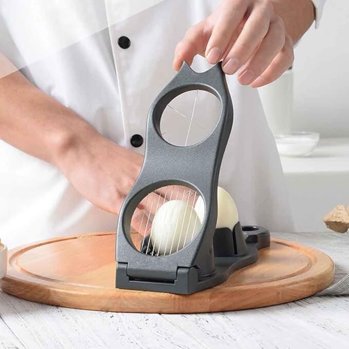 - Divkārša griešana: Lai sagrieztu olu kubiņos (piem., rasolam), vienkārši sagrieziet to vienreiz, pagrieziet olu par 90 grādiem un nospiediet vēlre.