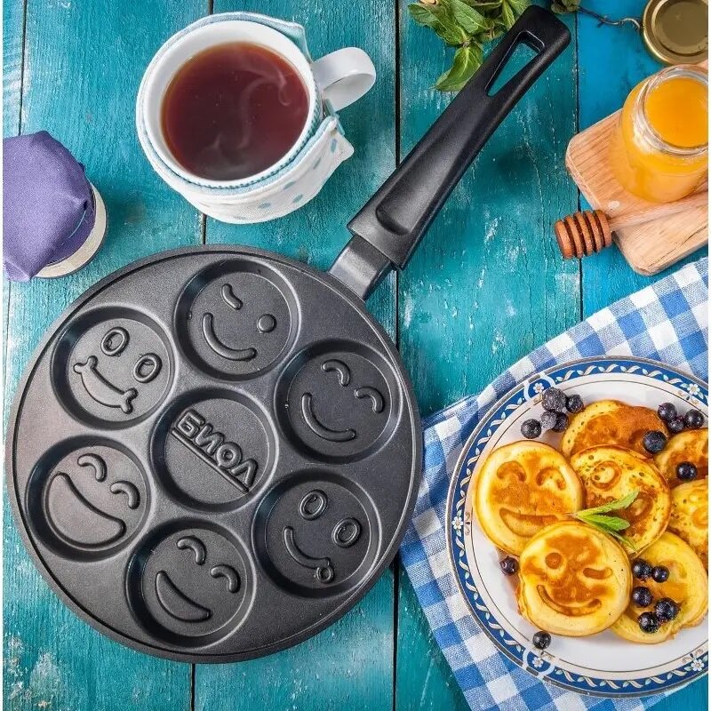 Alumīnija panna ar 7 “smaidiņu” formām jautru pankūku vai olu kultenis gatavošanai. Pārklāta ar nepiedegošu pārklājumu, ir nesakarstošs bakelīta rokturis. Piemērota gāzes, elektriskajām un keramiskajām plītīm (nav piemērota indukcijai). Diametrs: 24 cm.