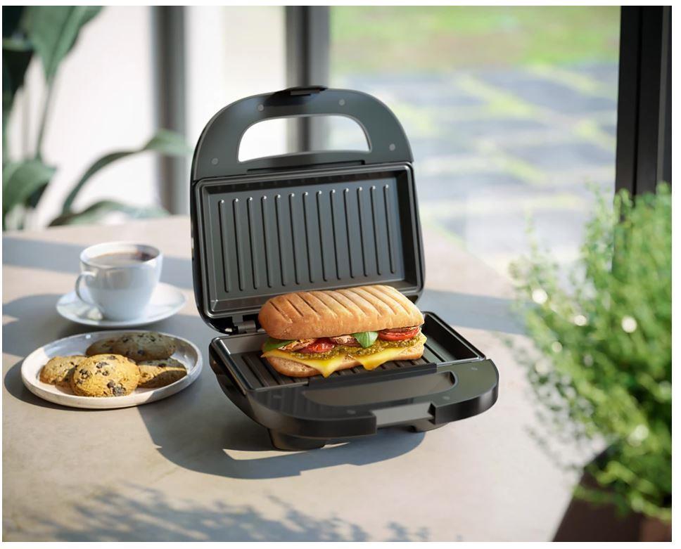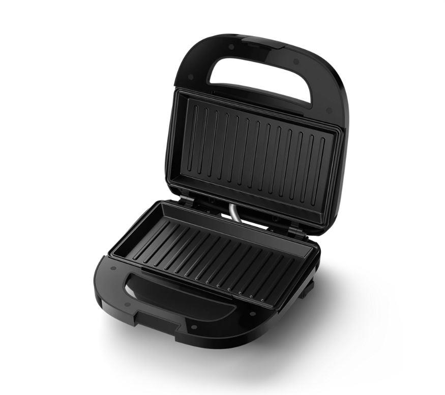 - Maināmas plāksnes (2-in-1): Komplektā atradīsiet divus pārus viegli maināmu plākšņu: klasiskām trīsstūra sviestmaizēm un grila (“Panini”).