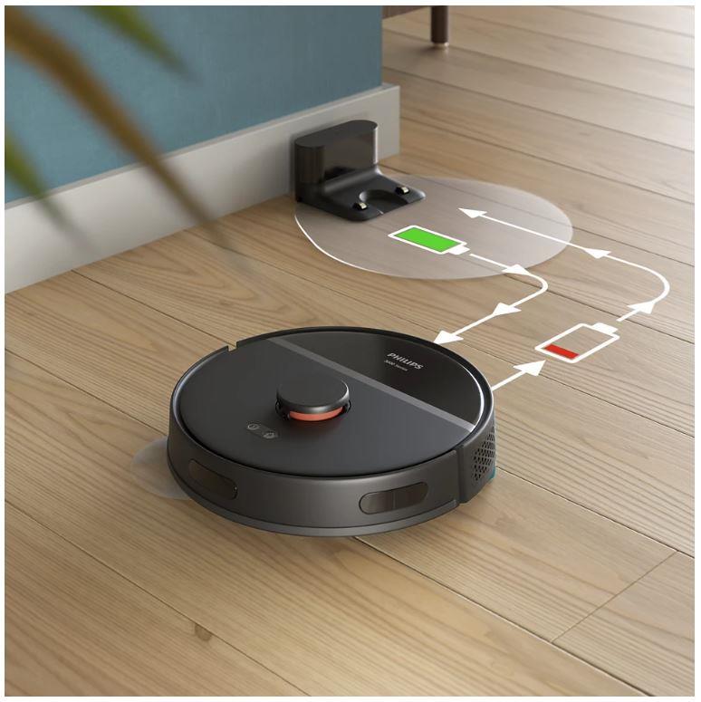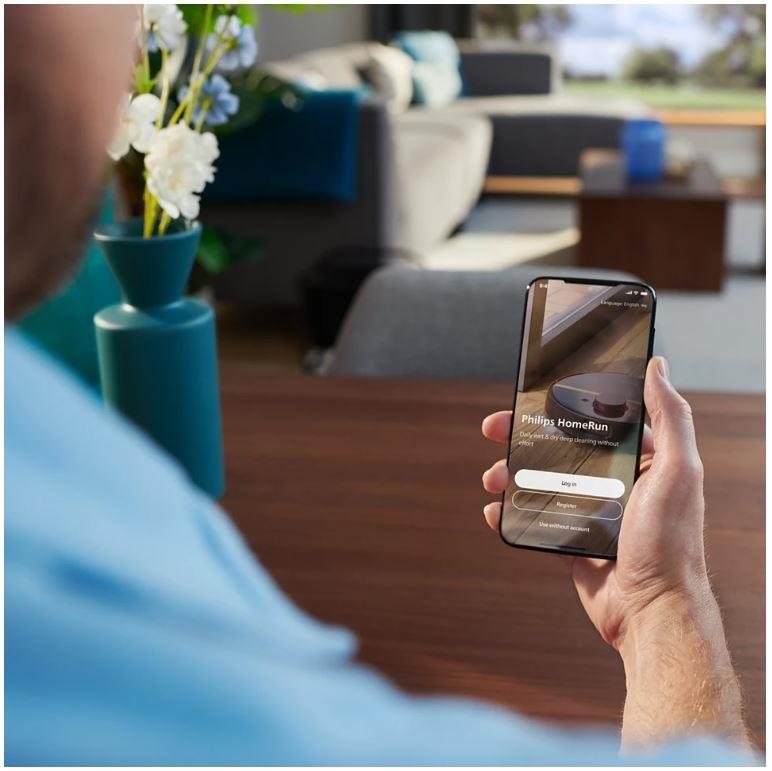 - Vadība ar “Philips HomeRun” lietotni: Pilnībā pielāgojiet tīrīšanu – iestatiet grafikus, aizliegtās zonas (gan sūkšanai, gan mazgāšanai), tīrīšanas režīmus katrai telpai tieši savā telefonā.