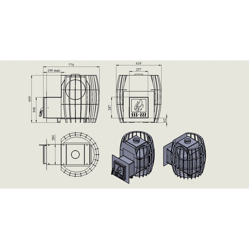 Svars: Pilnībā aprīkota krāsns ar akmeņiem sver aptuveni 190 kg. Pārliecinieties, ka pirts grīdas pamats ir stabils un iztur šādu slodzi.