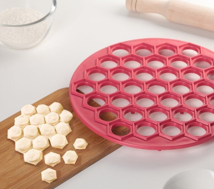 - Ražīgums: Īpašais šūnu izvietojums ļauj maksimāli izmantot mīklas laukumu un saražot lielu daudzumu pelmeņu ar vienu rullēšanu.