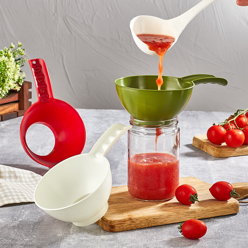 - Universāls izmērs: 130 mm (13 cm) diametrs ir optimāls ātrai šķidrumu, ievārījumu vai beramu produktu pārliešanai bez izšļakstīšanās.