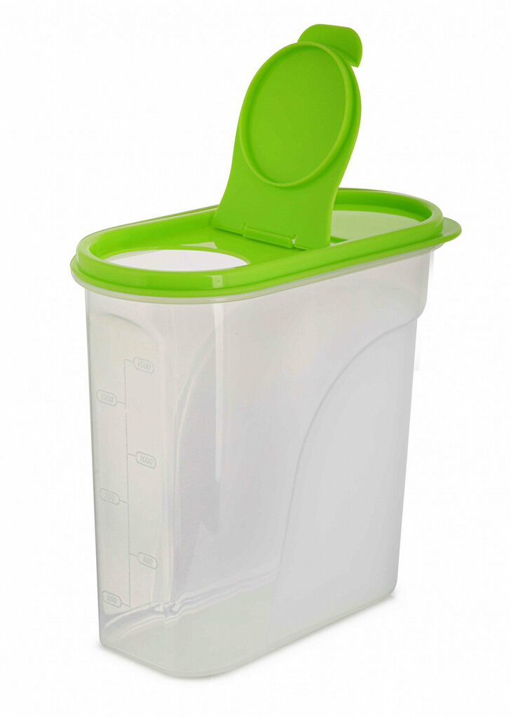 Ideāli piemērots miltu, cukura, rīsu, griķu, makaronu, pārslu, sauso brokastu vai pat dzīvnieku barības uzglabāšanai. Šaurā un augstā forma ļauj efektīvi izmantot vietu skapītī.