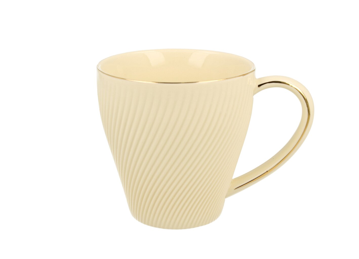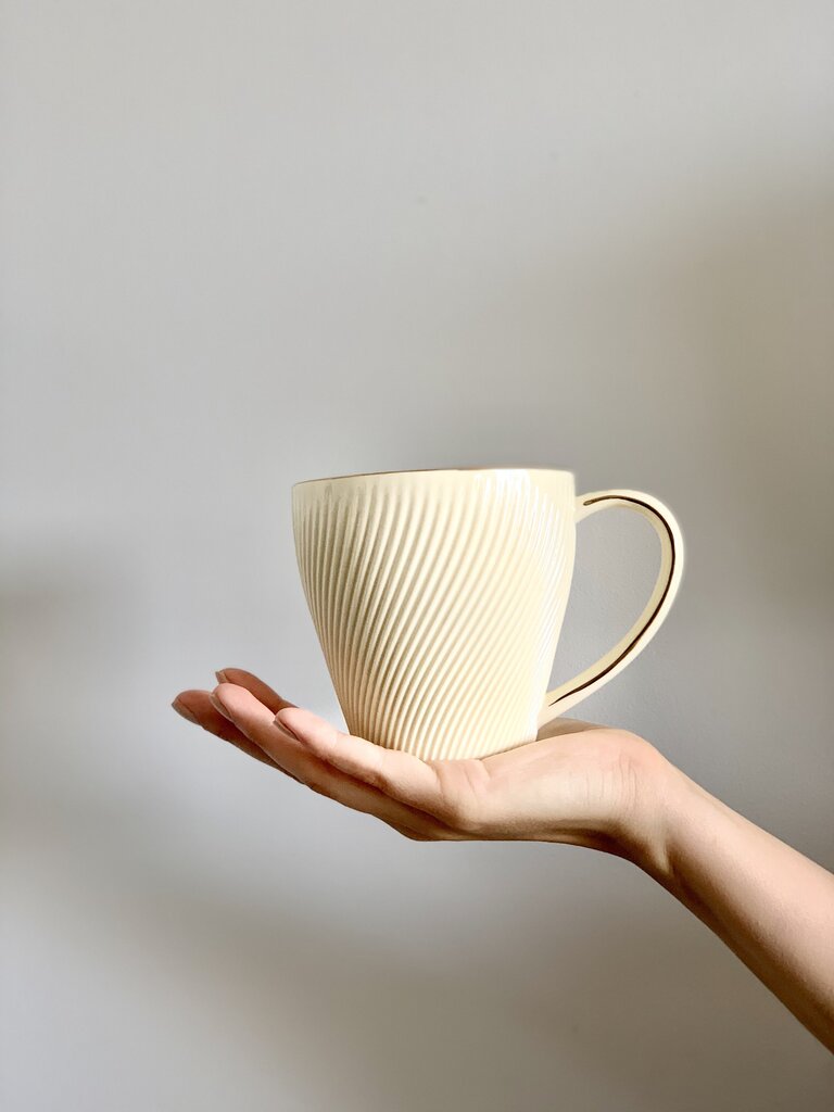 - Dekors: Krūzes virsma nav gluda – to rotā iespiests itāļu dizaina raksts (cilnis), kas piešķir traukam tekstūru un greznību. Maliņa dekorēta ar smalku zelta krāsas joslu.