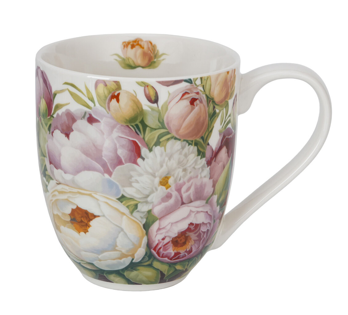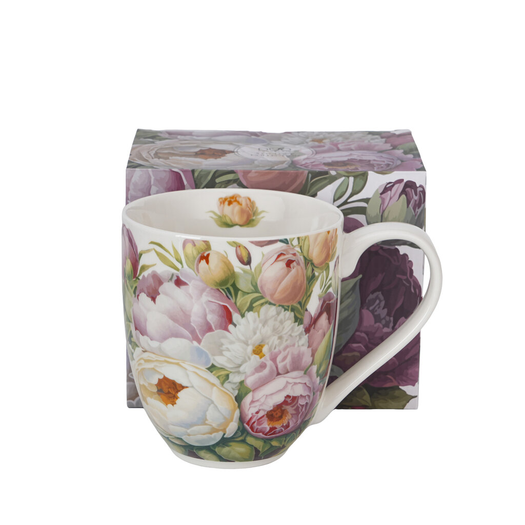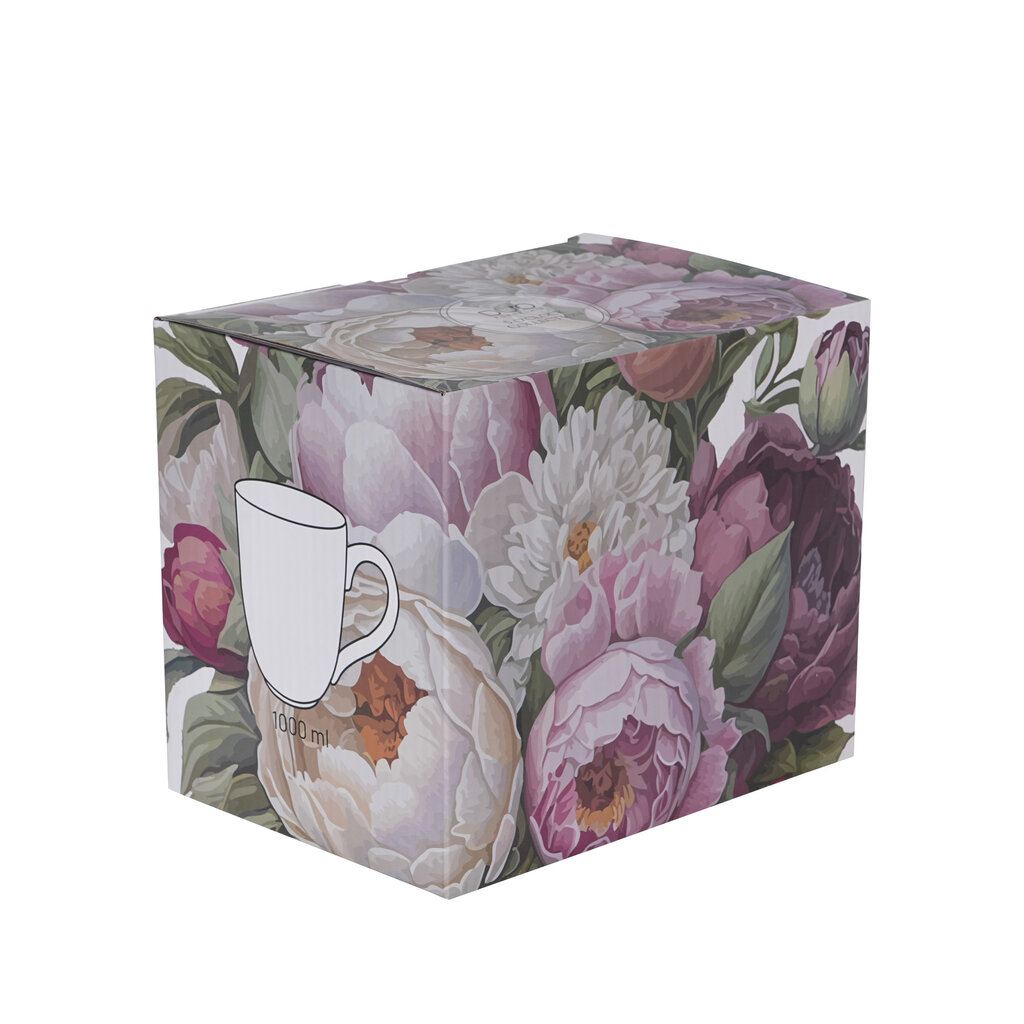 - Motīvs: Krūzi rotā grezns peoniju pušķis. Pasteļtoņu rozā, lavandas un baltās krāsas kombinācija simbolizē mīlestību un pārpilnību, piešķirot traukam izsmalcinātu šarmu.