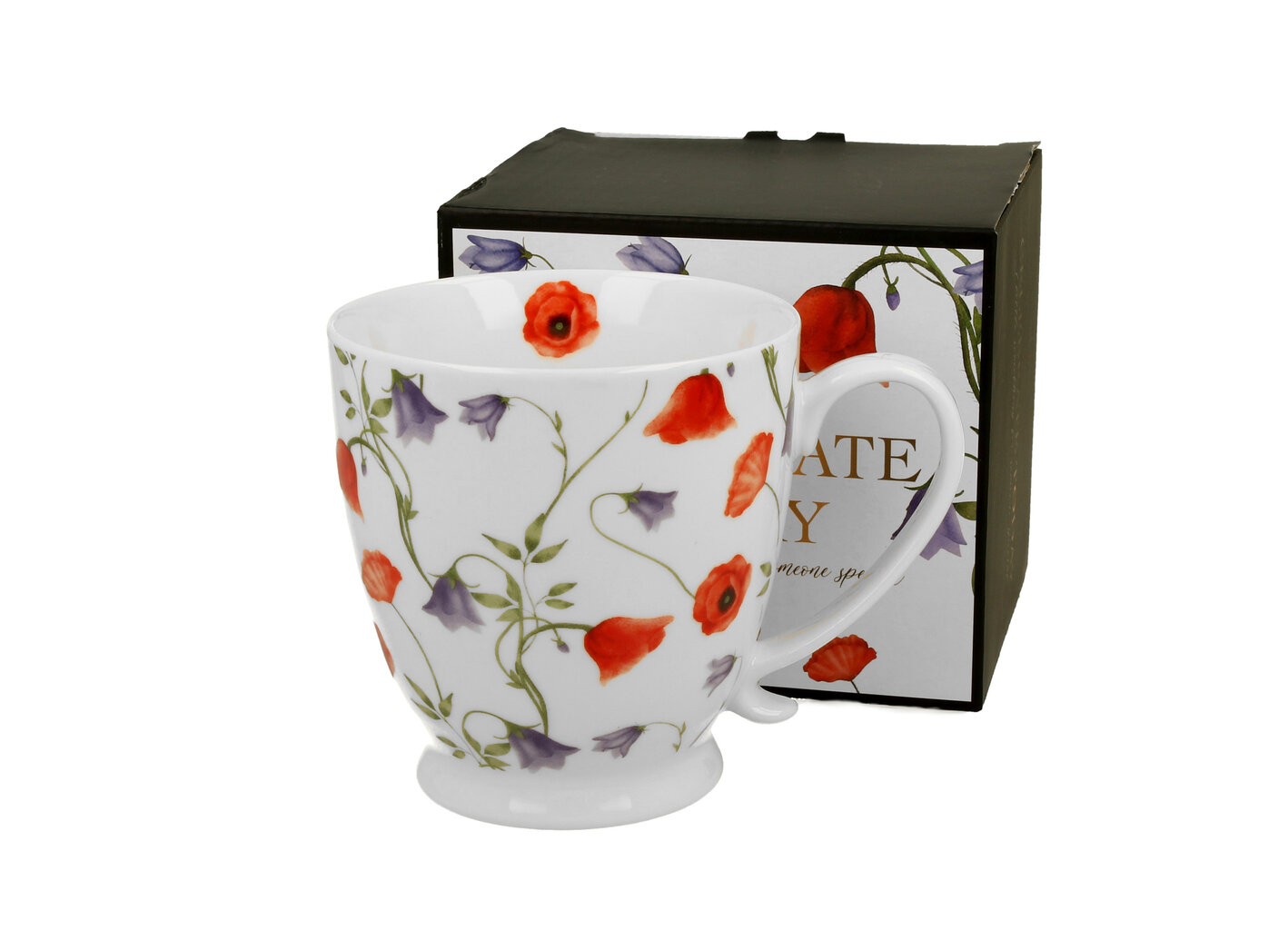- Unikāls dizains: Krūzi rotā kontrastējoša kompozīcija: mazas sarkanas magones, kas simbolizē kaisli, savijas ar violeti ziliem zvaniņiem, kas piešķir svaigumu.