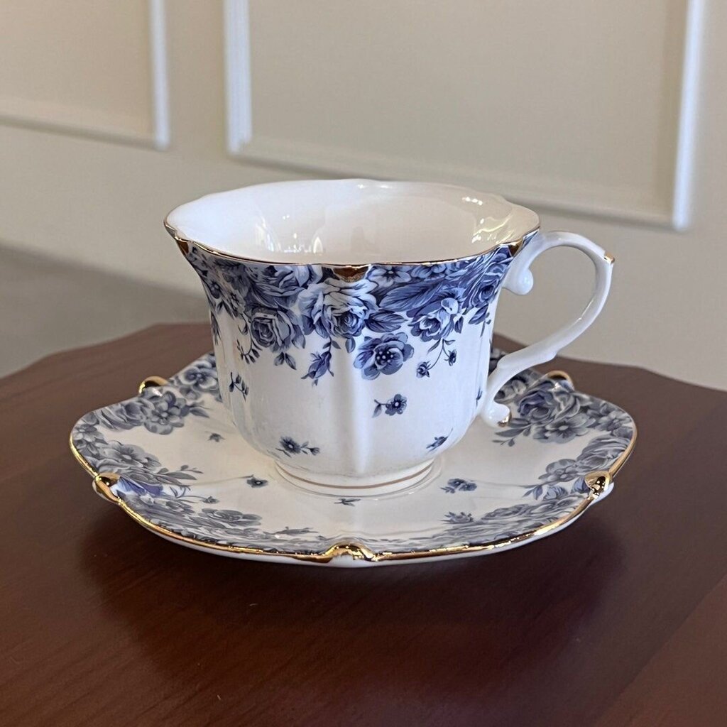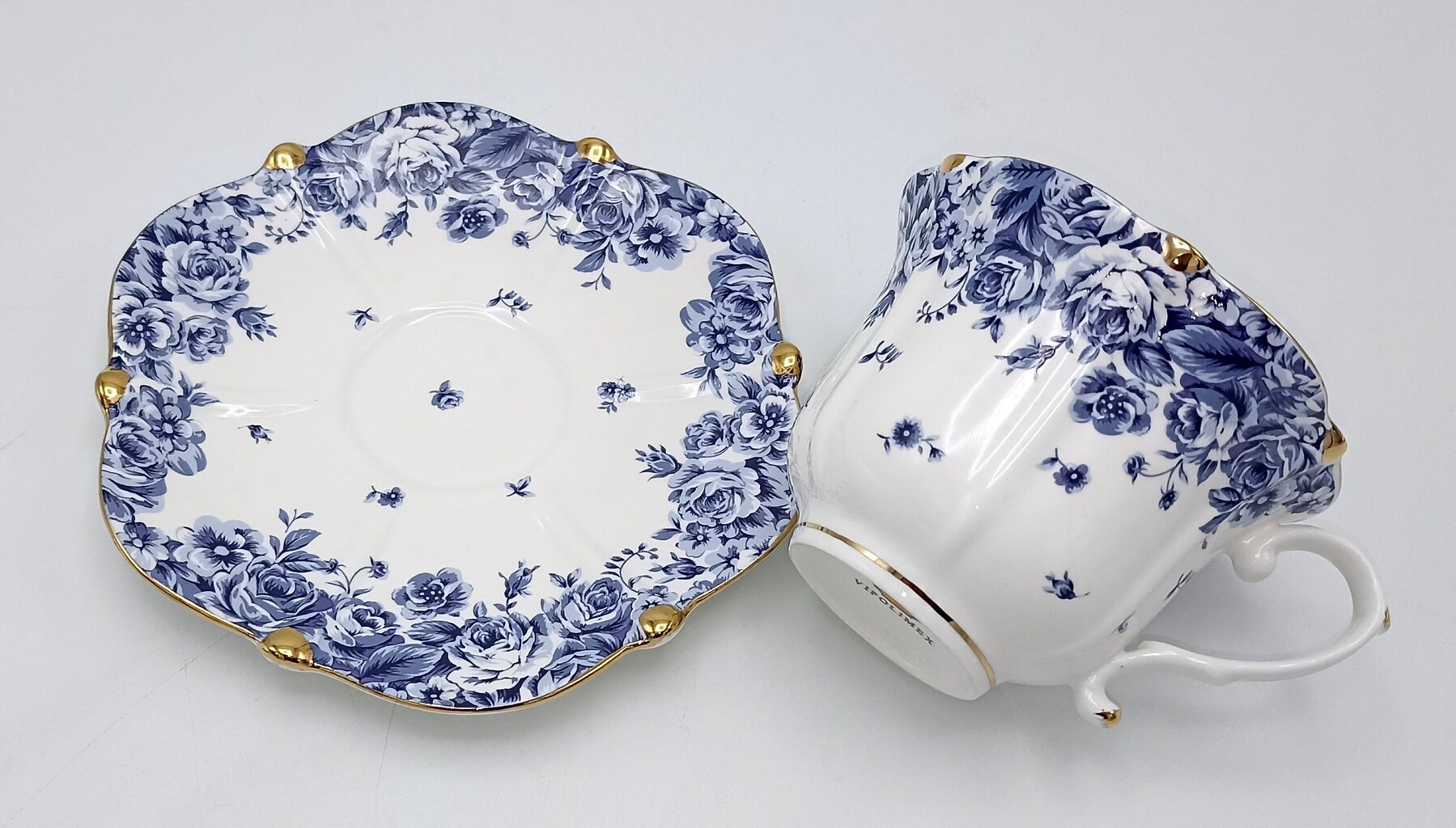 - Dizains: Trauki dekorēti ar klasisku zilu ziedu rakstu uz balta fona un rotāti ar greznu zelta krāsas apdari uz maliņām, piešķirot komplektam aristokrātiskumu.