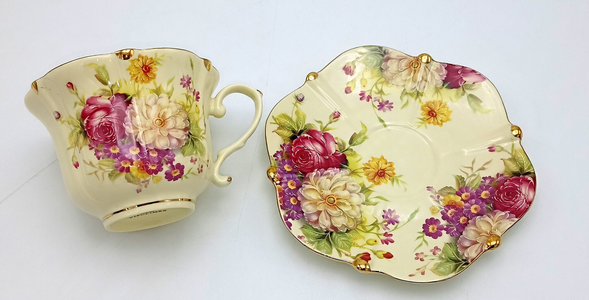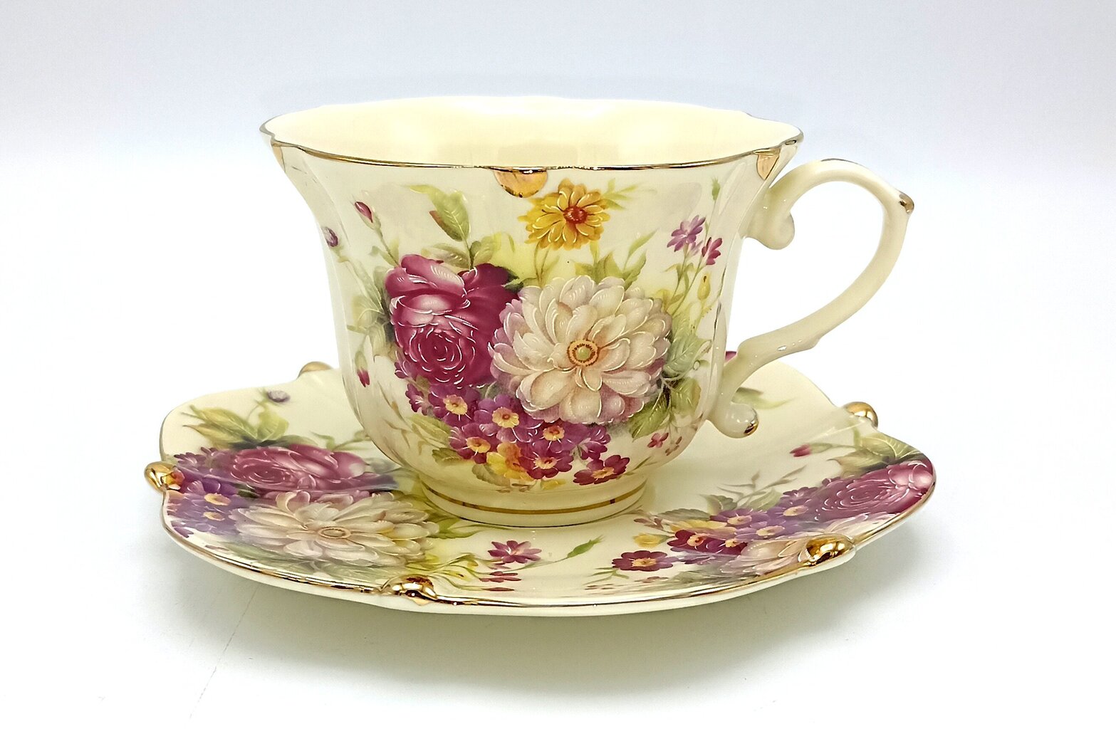 - Dizains: Piesātinātas ziedu krāsas (dominē violetie un zilganie toņi) lieliski sader ar krēmkrāsas porcelāna fonu. Greznības iespaidu pabeidz smalka zelta apdare uz maliņām un rokturiem.