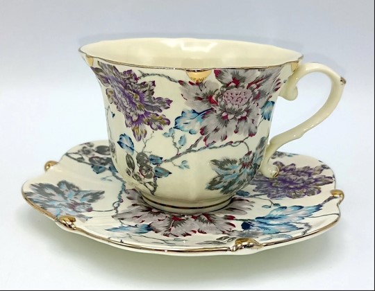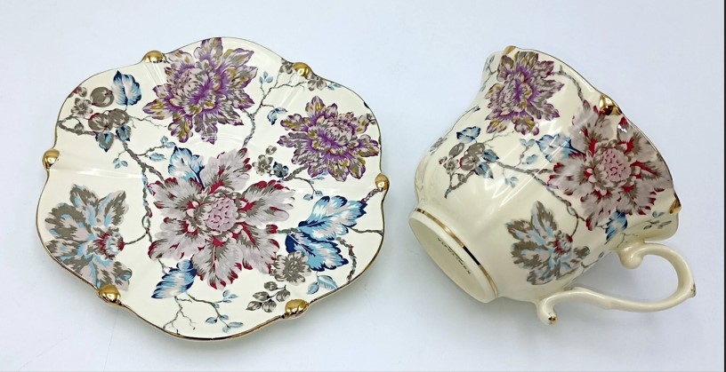 - Dizains: Silto krēmkrāsas fonu rotā eleganti krāsaini ziedi. Krūzīšu un apakštasīšu maliņas ir viļņotas un dekorētas ar greznu zelta joslu, kas piešķir traukiem vintage šarmu.