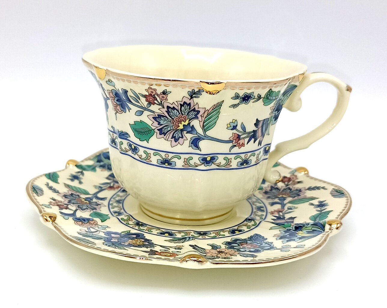 • Dizains: Balto porcelānu rotā bagātīgs zilu rožu un ziedu raksts. Krūzīšu un apakštasīšu maliņas ir viļņotas un dekorētas ar greznu zelta joslu, kas piešķir traukiem aristokrātiskumu.