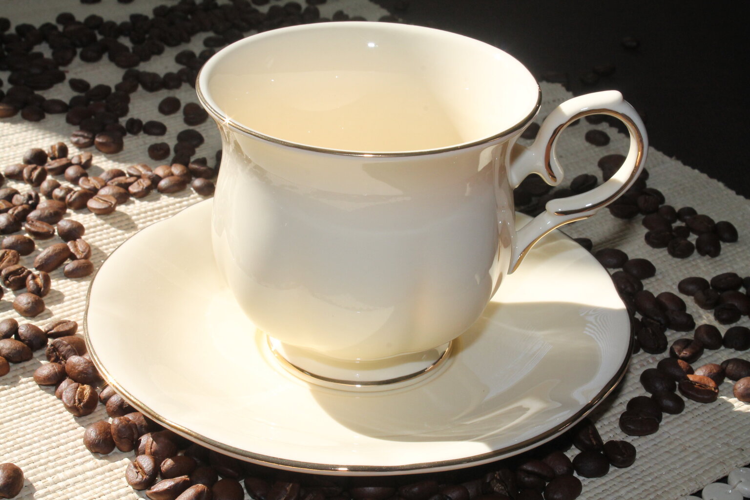 - Dekors: Krūzes un apakštasītes rotātas ar izteiksmīgiem rožu krūma motīviem. Siltie ziedu toņi harmoniski sader ar porcelāna krēmkrāsu, bet zelta apdare piešķir komplektam izsmalcinātību un pabeigtību.