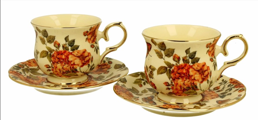 - Dizains: Krūzītes un apakštasītes rotā izteiksmīgi, gleznieciski rožu krūma motīvi. Piesātinātas ziedu krāsas harmoniski sader ar krēmkrāsas fonu, bet greznības sajūtu pabeidz smalka zelta apdare uz maliņām.