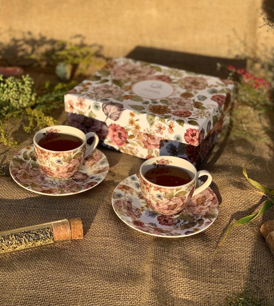 Viss komplekts iepakots greznā, dekoratīvā kastē, kuras dizains atkārto trauku motīvu – pasteļtoņu ziedus. Tā ir gatava, gaumīga dāvana sievietēm, vīriešiem, kolēģiem vai skolotājiem dzimšanas dienā vai kā pateicība.