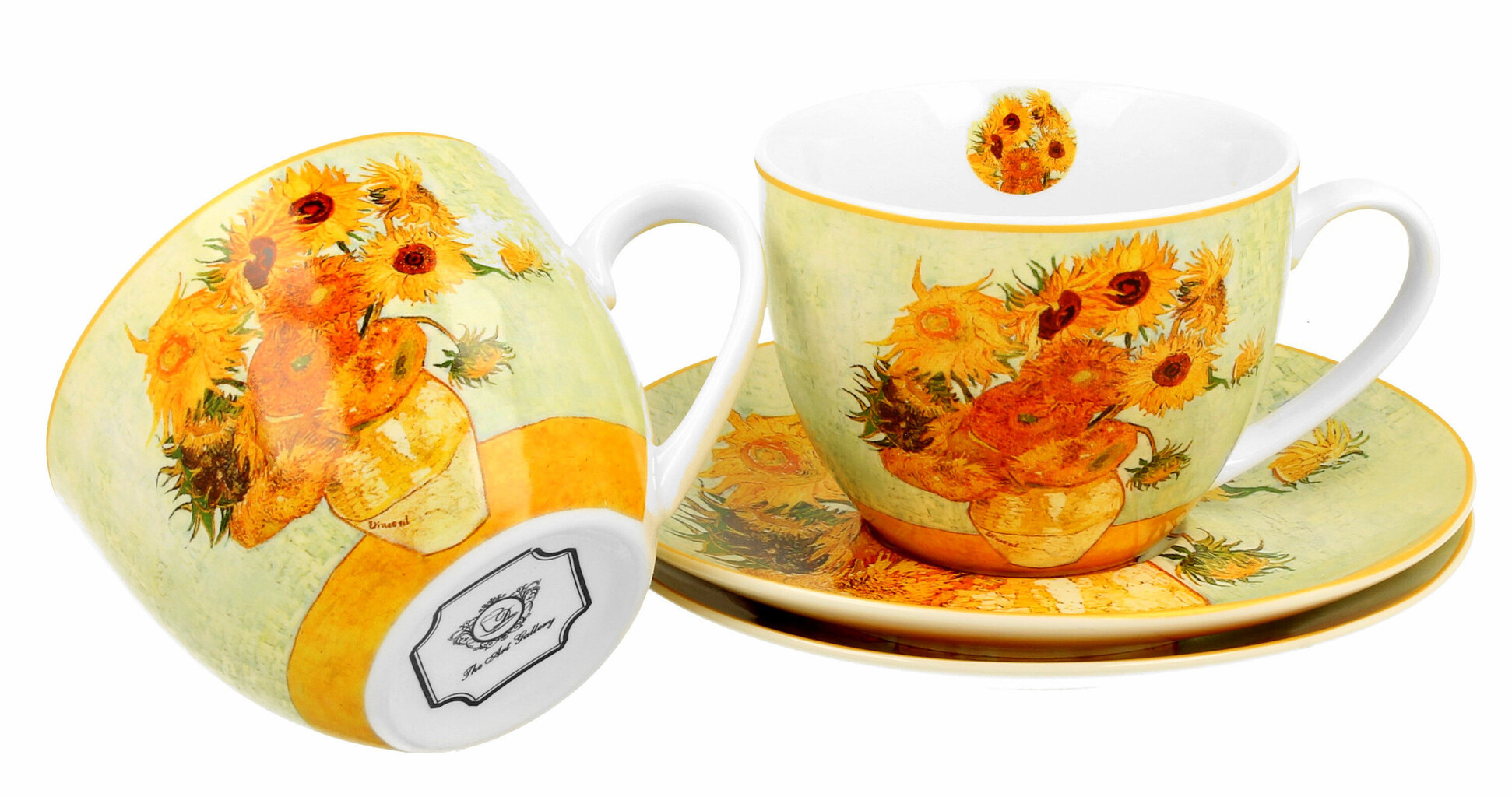 - “Saulespuķu” motīvs: Krūzītes un apakštasītes rotā V. van Goga gleznas “Saulespuķes” reprodukcijas fragmenti. Pasteļtoņu, taču piesātinātas un siltas krāsas lieliski atveido oriģinālā darba raksturu un piešķir mājīgumu.