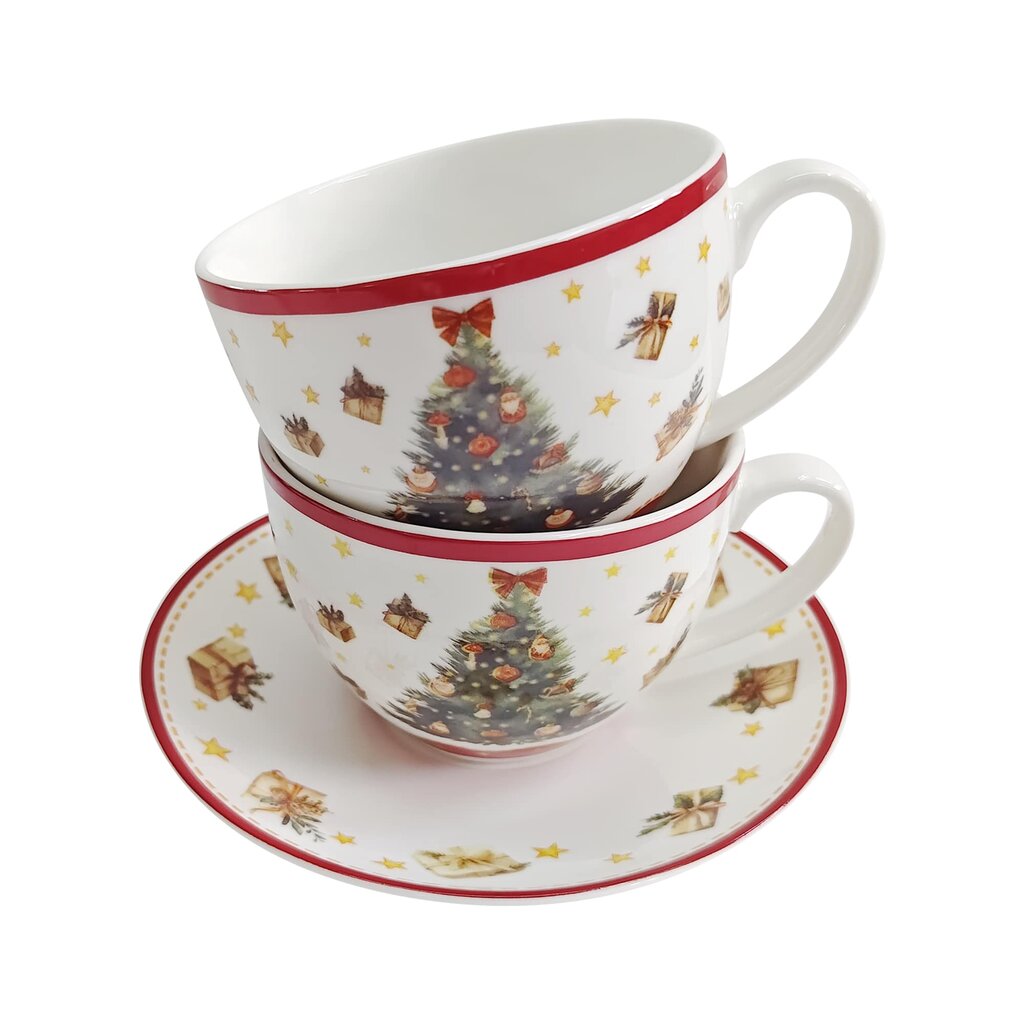 Sajūtiet īsto Ziemassvētku garu ar šo eleganto divu krūzīšu un apakštasīšu komplektu. Tradicionālā Ziemassvētku eglīte, ko ieskauj mirdzošas zelta zvaigznes un dāvanas, ienesīs jūsu mājās siltumu un mājīgumu.