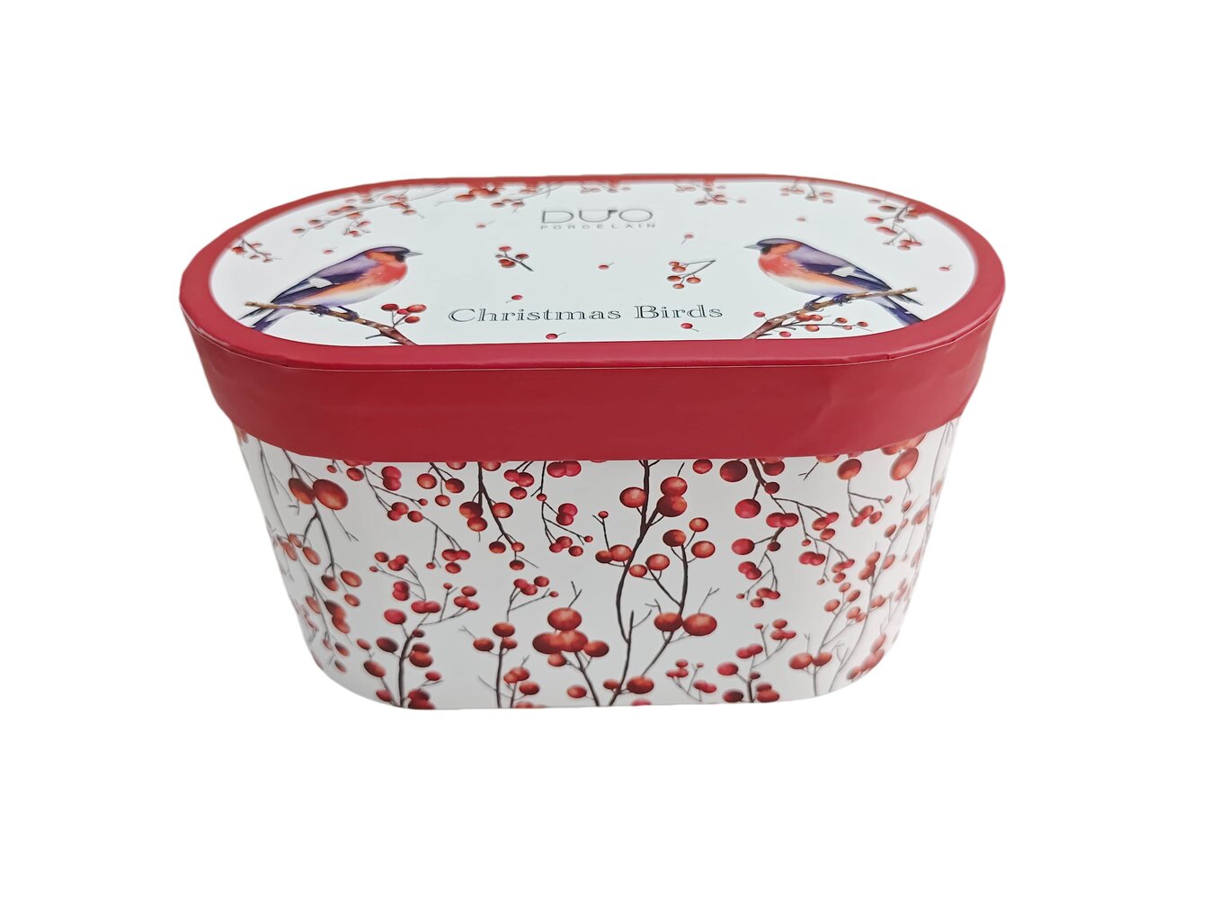 - Dāvanu iepakojums: Komplekts ir iepakots elegantā ovālā kastē, kas dekorēta ar to pašu putnu motīvu, tāpēc tā ir gatava, sentimentāla dāvana Ziemassvētkos vai citā gadījumā.