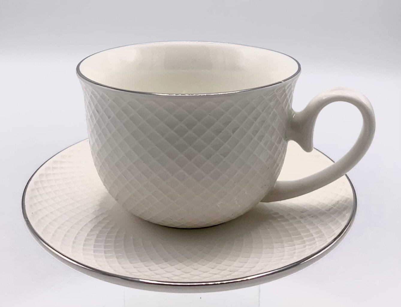 - Išskirtinis dizainas: Reljefinis rombų raštas suteikia puodeliams ir lėkštutėms unikalumo ir elegancijos.
