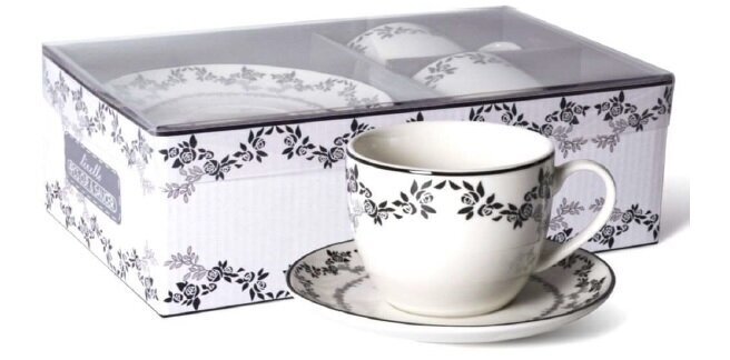 Šis porcelianinis puodelių ir lėkštučių rinkinys, papuoštas subtiliais gėlių raštais, suteiks jūsų stalui jaukumo ir romantikos. Tai puikus pasirinkimas tiek rytinei kavai, tiek popietės arbatai, paverčiantis kasdienį gėrimo ritualą maža švente.