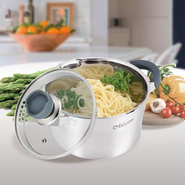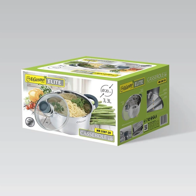 Katls Maestro MR 3507-20 3,3 litru tilpums, kas izgatavots no augstas kvalitātes nerūsējošā tērauda, ir ar stikla vāku ar diametru 20 centimetri, un vāka apakšā ir maliņa ar atverēm šķidruma novadīšanai. . Tērauda pannas rokturi ir kniedēti un pārklāti ar nesildošu paliktni. Šī modeļa dizaina iezīmju kombinācija – iespēja iztukšot ūdeni un iztukšot saturu – panna MR 3507-20 ir ideāls variants kartupeļu un citu dārzeņu vārīšanai, kuras beigās nepieciešams izliet ūdeni. kurā tie tika pagatavoti. ēdiena gatavošana. Uz pannas korpusa iekšējās sienas ir šķidruma tilpuma skala.