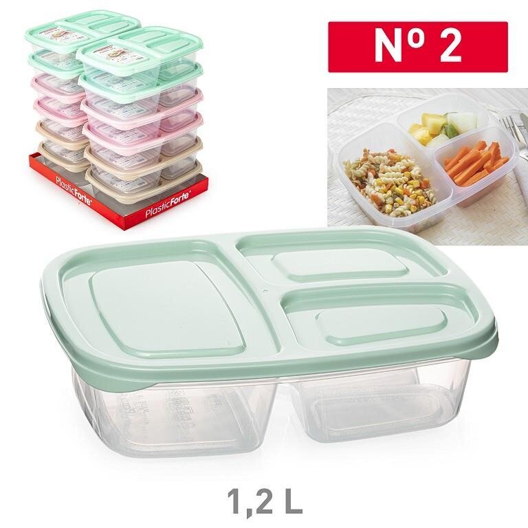 Šī “PlasticForte” pusdienu kārba ir ideāls risinājums tiem, kas vēlas ēst veselīgi un daudzveidīgi, pat atrodoties darbā, skolā vai ceļojumā. 1,2 litru tilpums, kas sadalīts trīs atsevišķos nodalījumos, ļauj ērti atdalīt pamatēdienu no piedevām vai uzkodām, nesajaucot garšas.