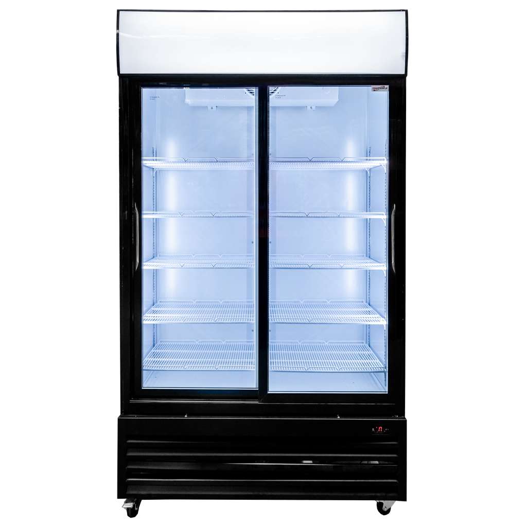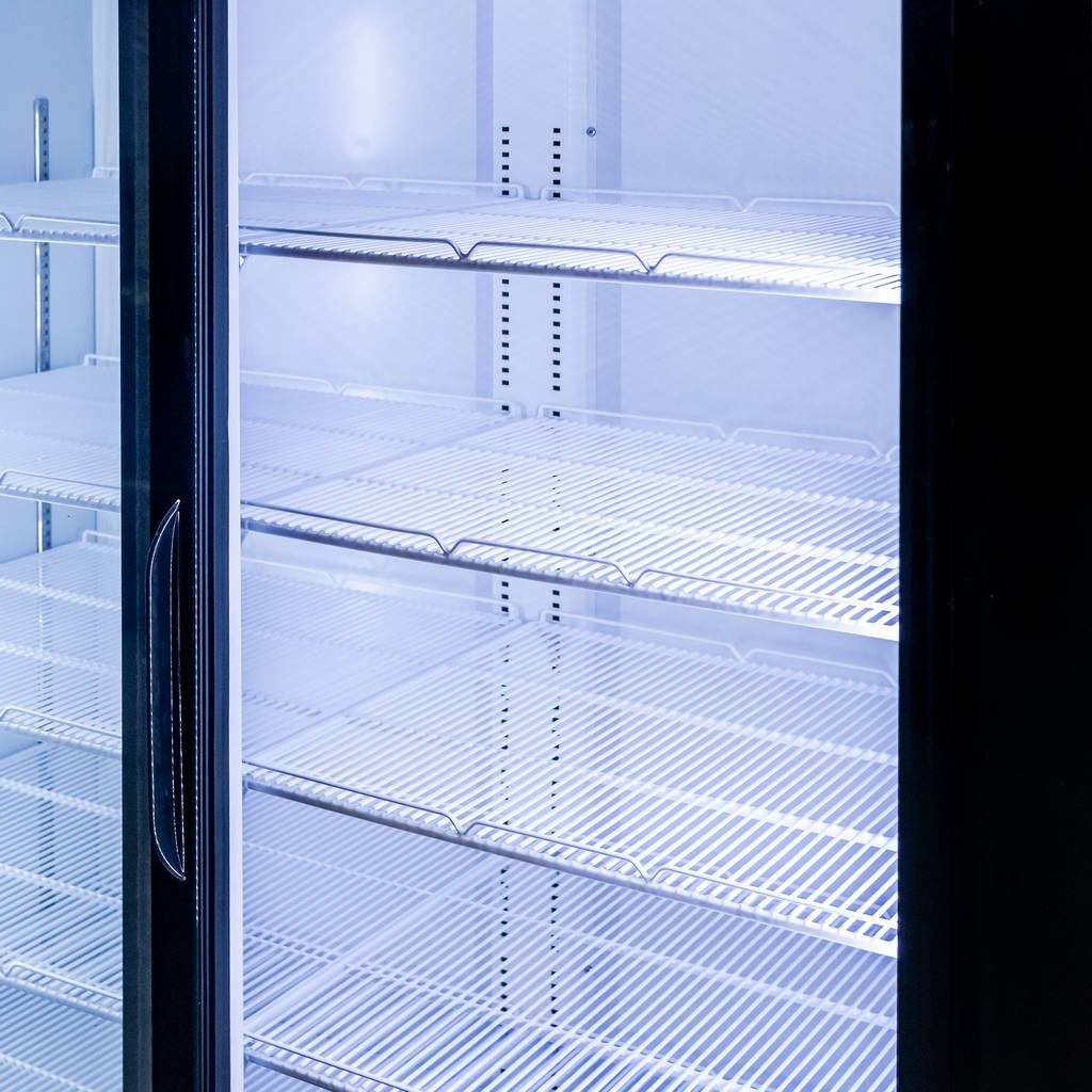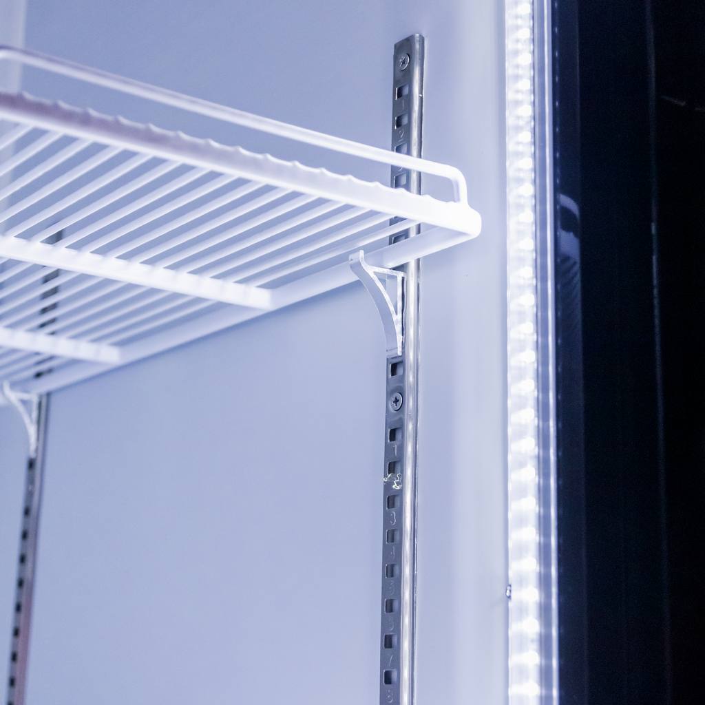 Vertikālās LED lentes ir uzstādītas abās durvju pusēs, tāpēc viss sortiments ir skaidri redzams un bez ēnām.
