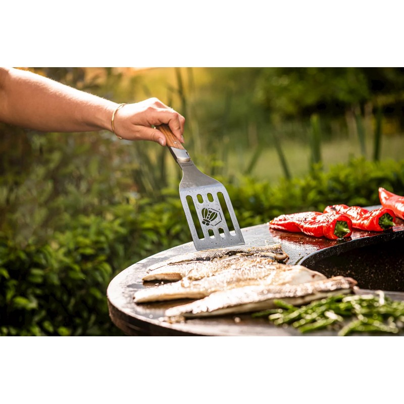- Liels izmērs: XL izmērs ļauj viegli apgriezt un pārvietot lielākus pārtikas produktus, piemēram, steikus vai zivis, uz grila.