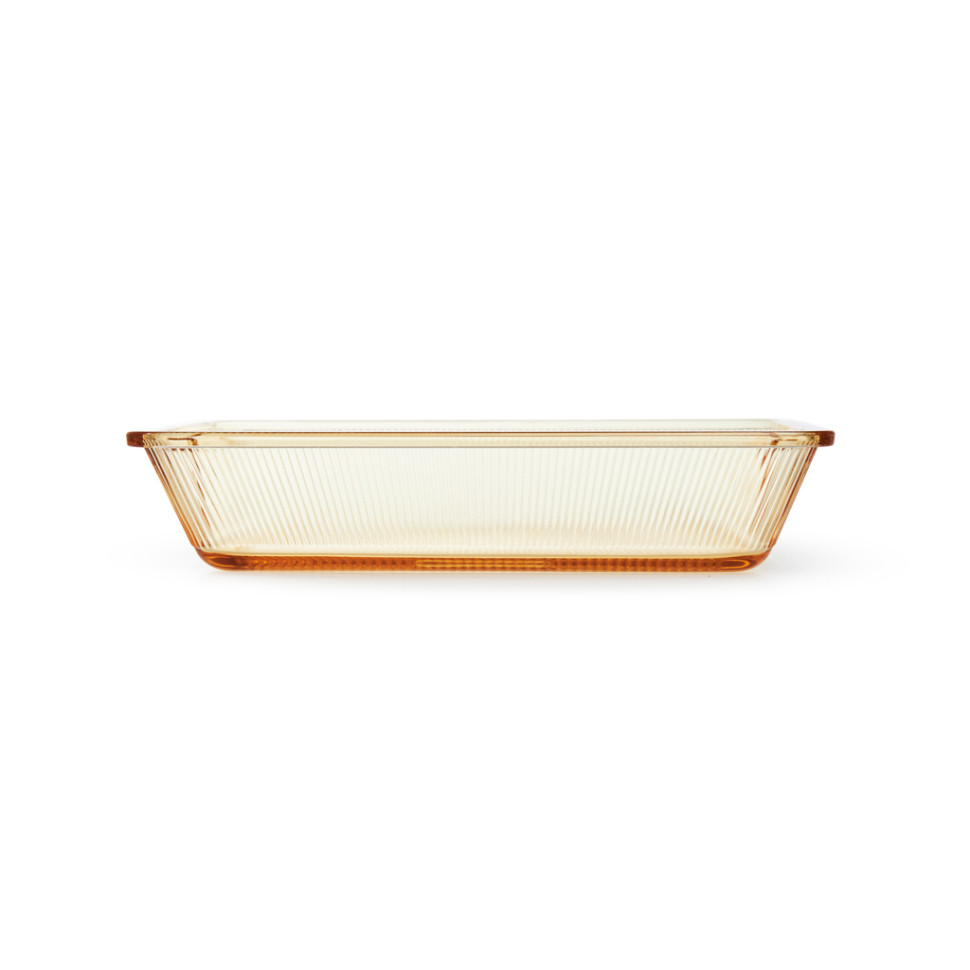 Šis trauks ir izgatavots no izturīga borosilikāta stikla, kam piemīt izcila izturība pret augstām temperatūrām. Formas dizains ir ļoti īpašs – dzintarkrāsas stiklam ir stilīgi rievotas malas un ērti iebūvēti rokturi īsajās malās. Trauka apakšai ir īpašs reljefs (teksturēts) pārklājums, kas palīdz saglabāt ēdiena struktūru.