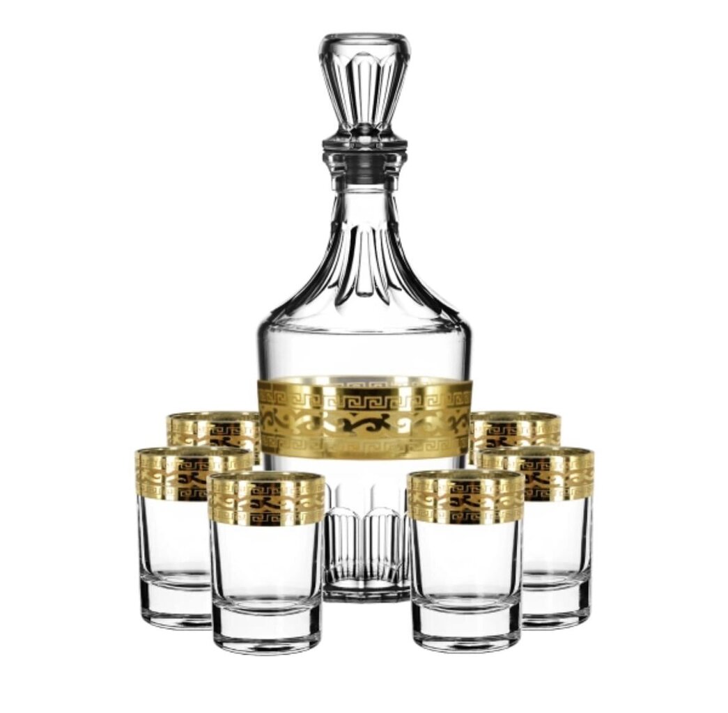 - Dizains: Caurspīdīgs stikls ir bagātīgi dekorēts ar zelta krāsas joslām ar klasisku grieķu ornamentu (meandru) un stilizētiem rakstiem. Tas piešķir traukiem antīkas greznības sajūtu.