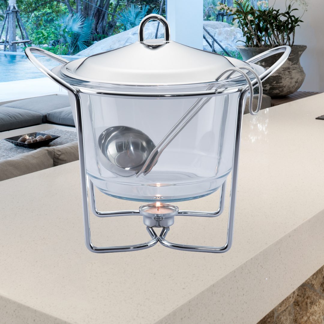 - Stikla zupas katls ar apkuri, varēsi eleganti nolikt ēdienu tieši no virtuves uz galda.