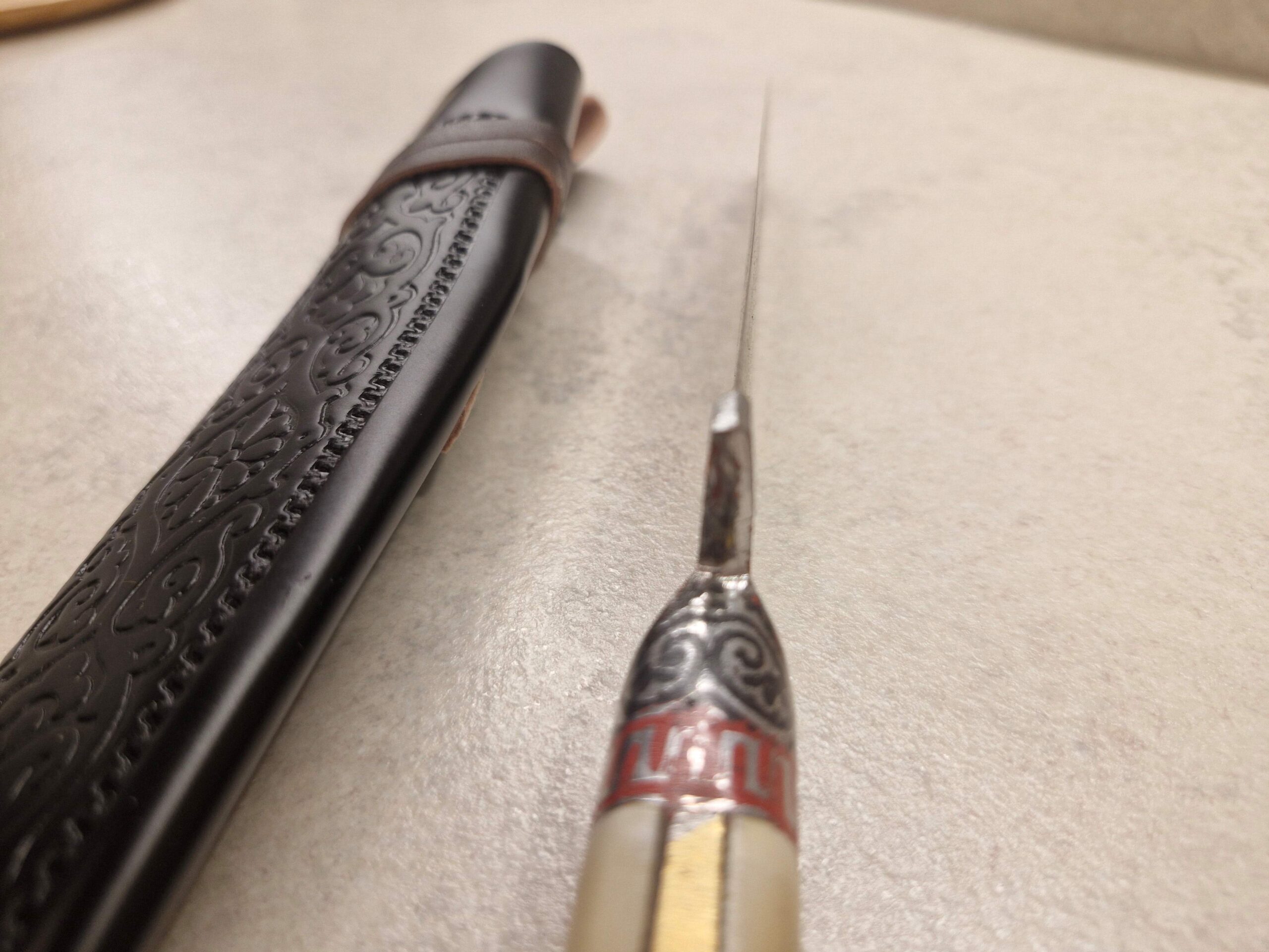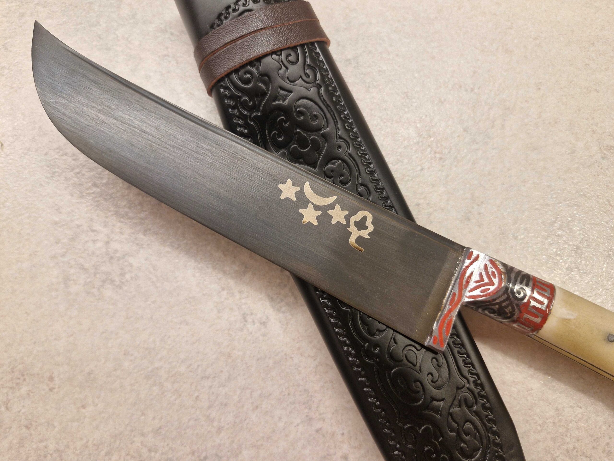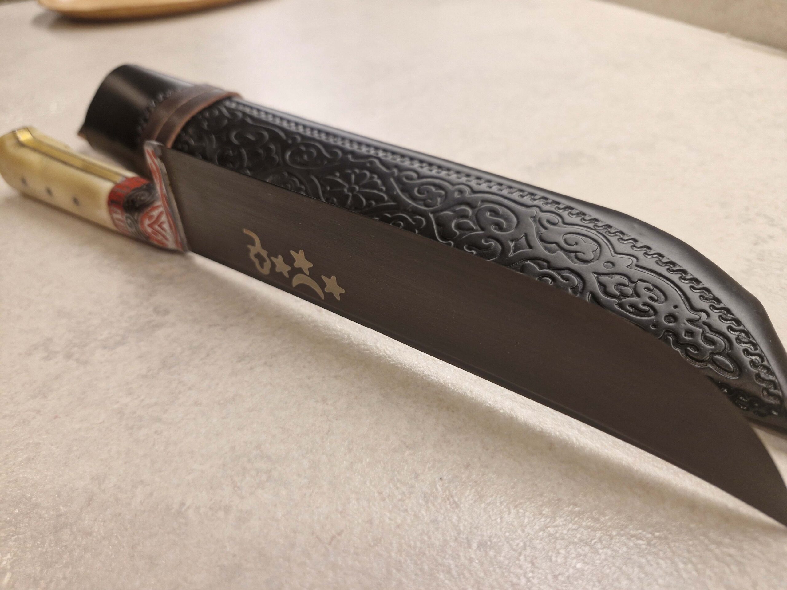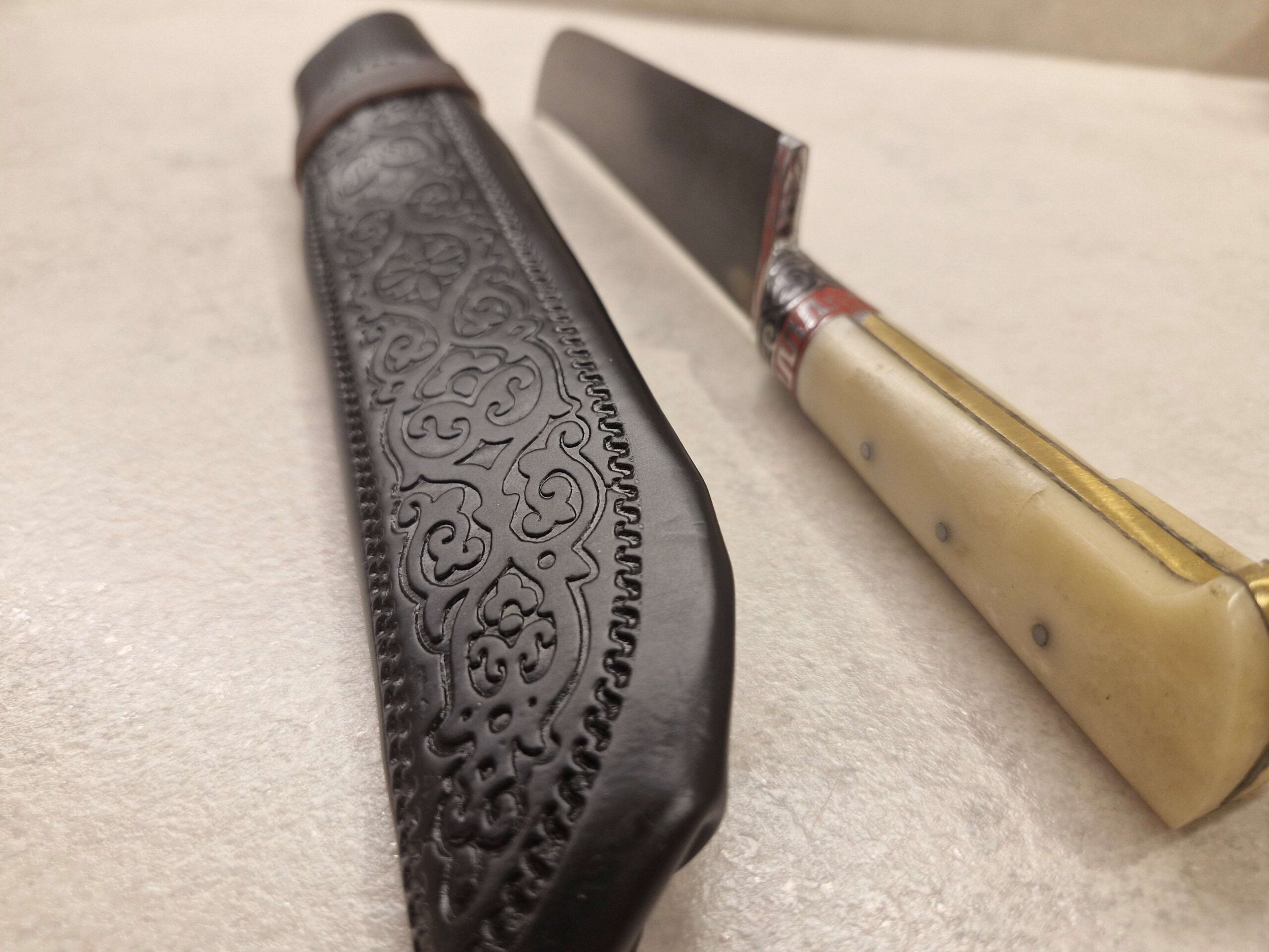 Tradicionāla maksts komplektā: Izgatavota no mākslīgās ādas ar austrumu rakstiem, kas paredzēta naža aizsardzībai.