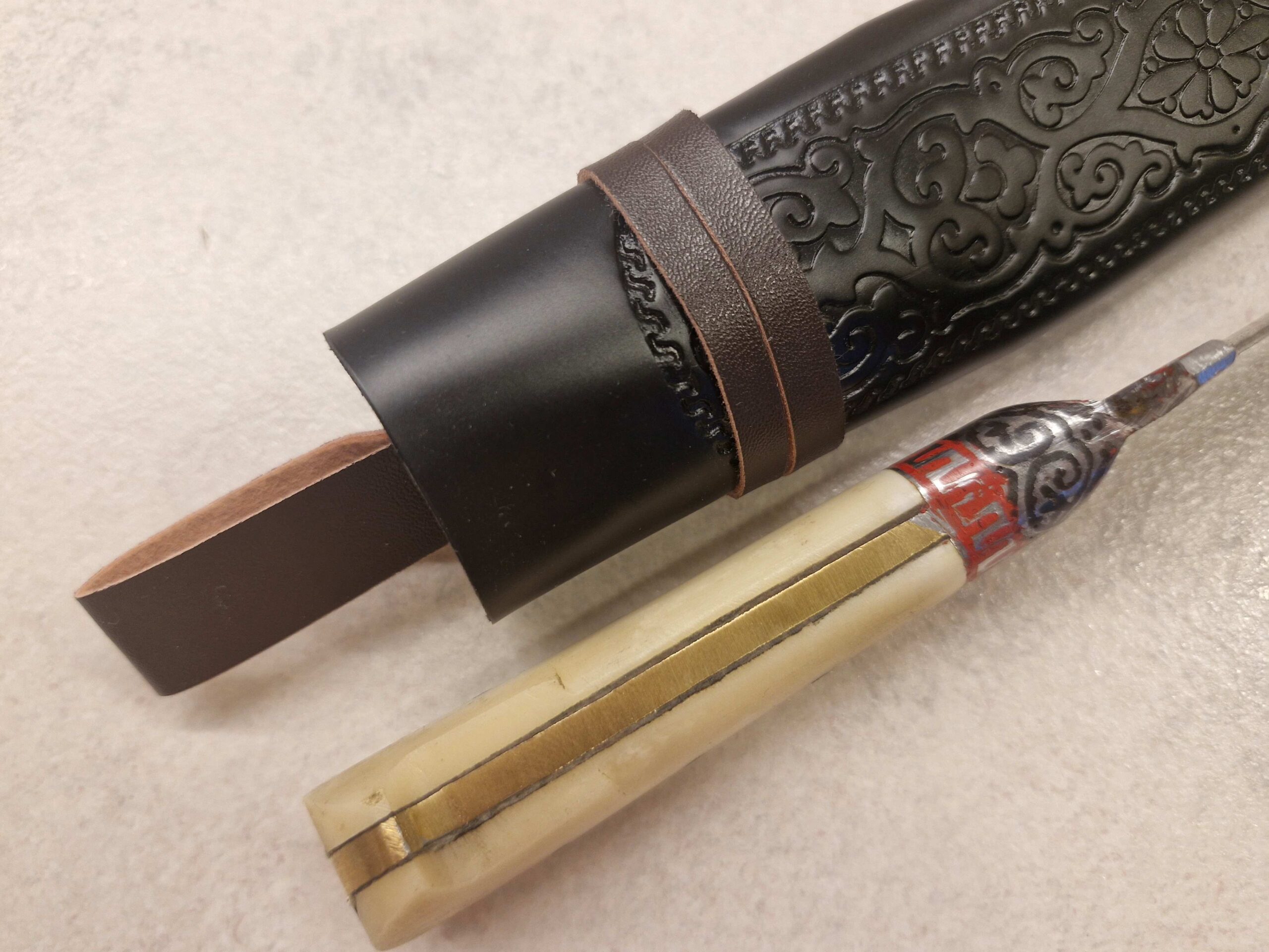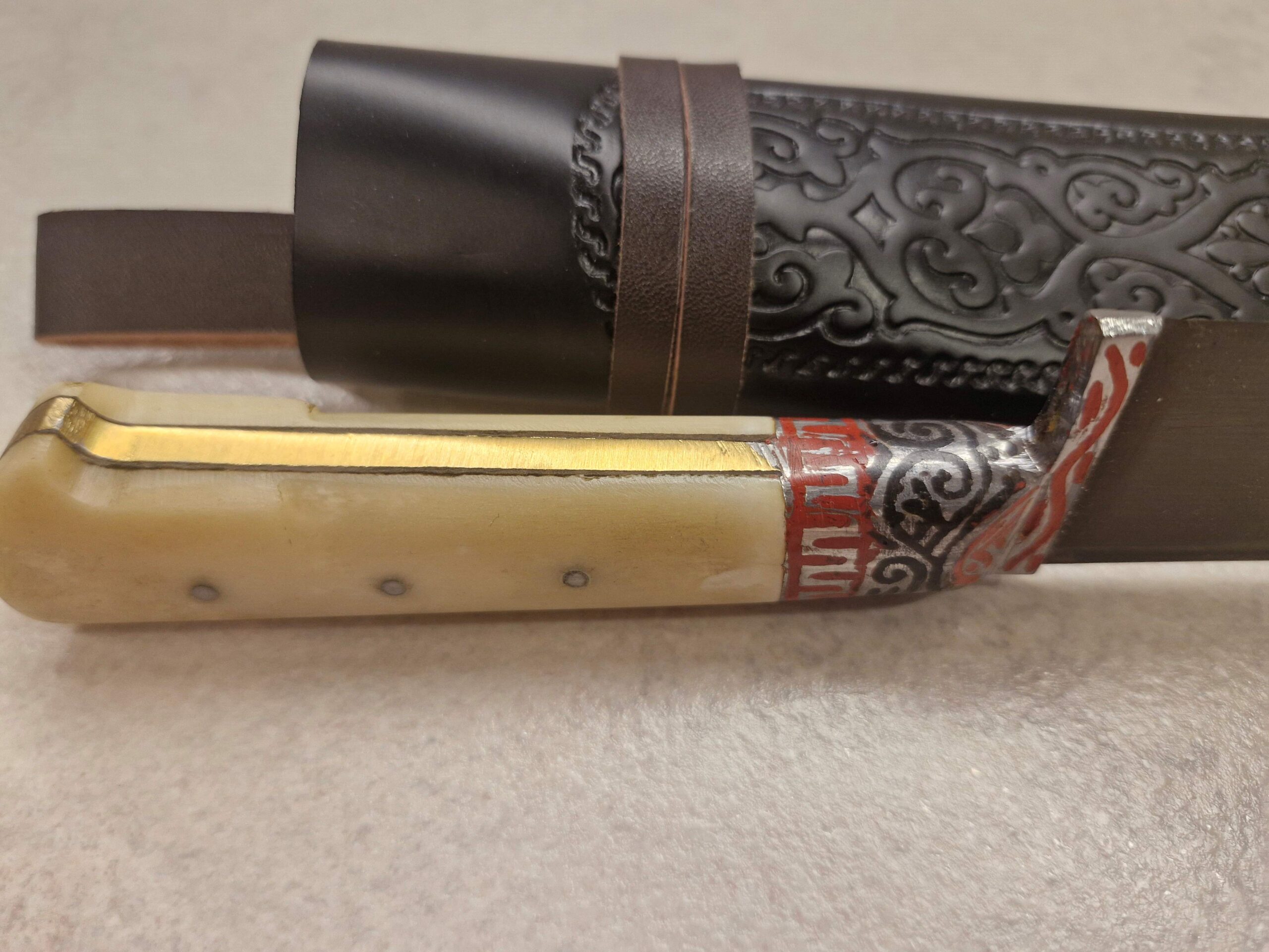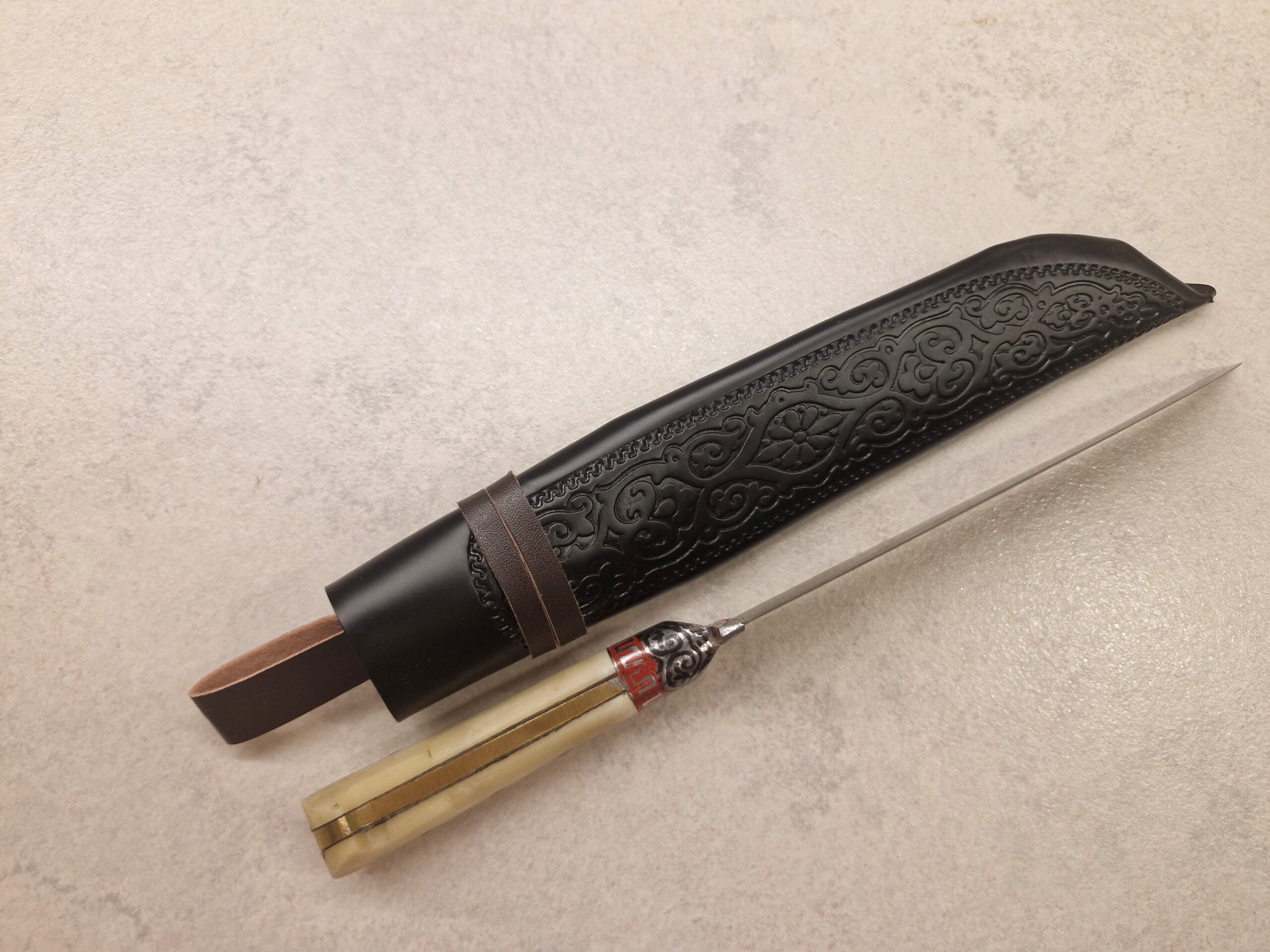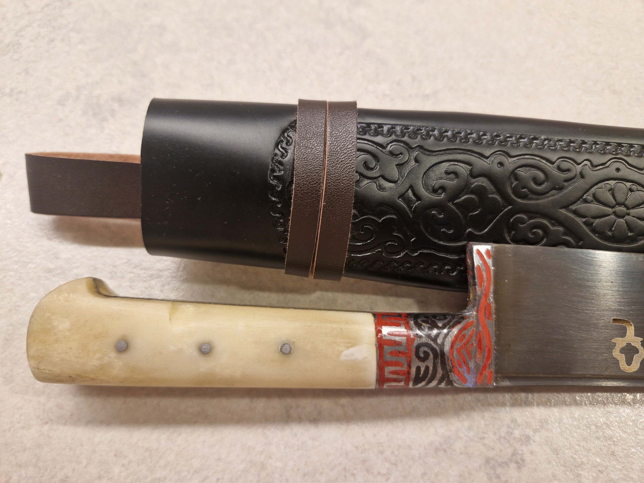 Tradicionāla maksts komplektā: Izgatavota no mākslīgās ādas ar austrumu rakstiem, kas paredzēta naža aizsardzībai.
