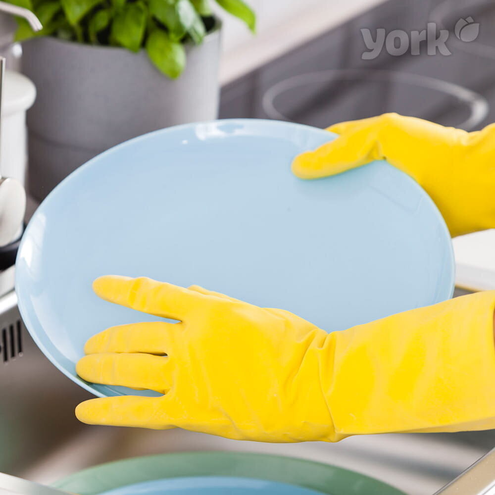 Šie “YORK” gumijas cimdi (L izmērs) ir nepieciešams piederums katrā mājā. Tie paredzēti, lai aizsargātu jūsu roku ādu un manikīru no ūdens, tauku un agresīvu tīrīšanas līdzekļu negatīvās ietekmes, veicot ikdienas mājas darbus.