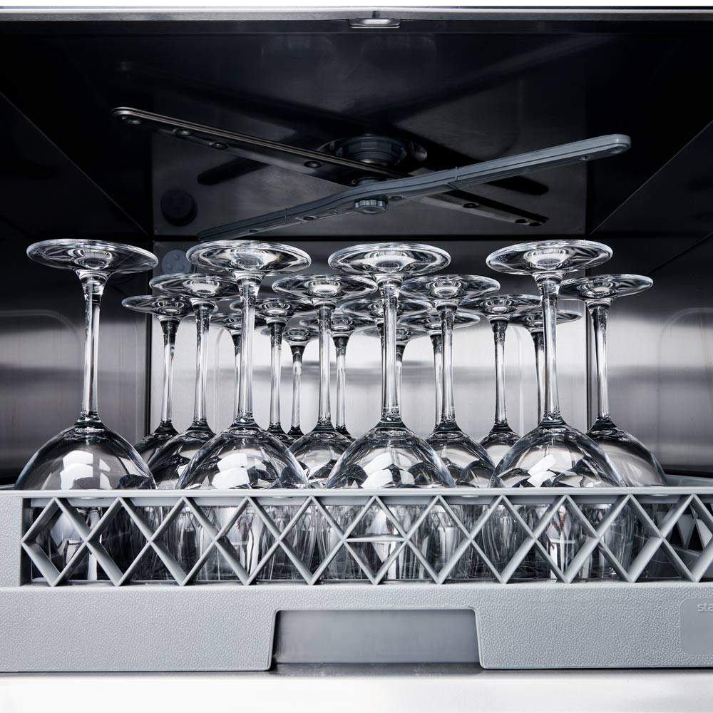 Daudzpusība: trauku mazgājamā mašīna efektīvi mazgā un sterilizē glāzes, šķīvjus un galda piederumus, padarot to piemērotu dažāda veida virtuvēm.