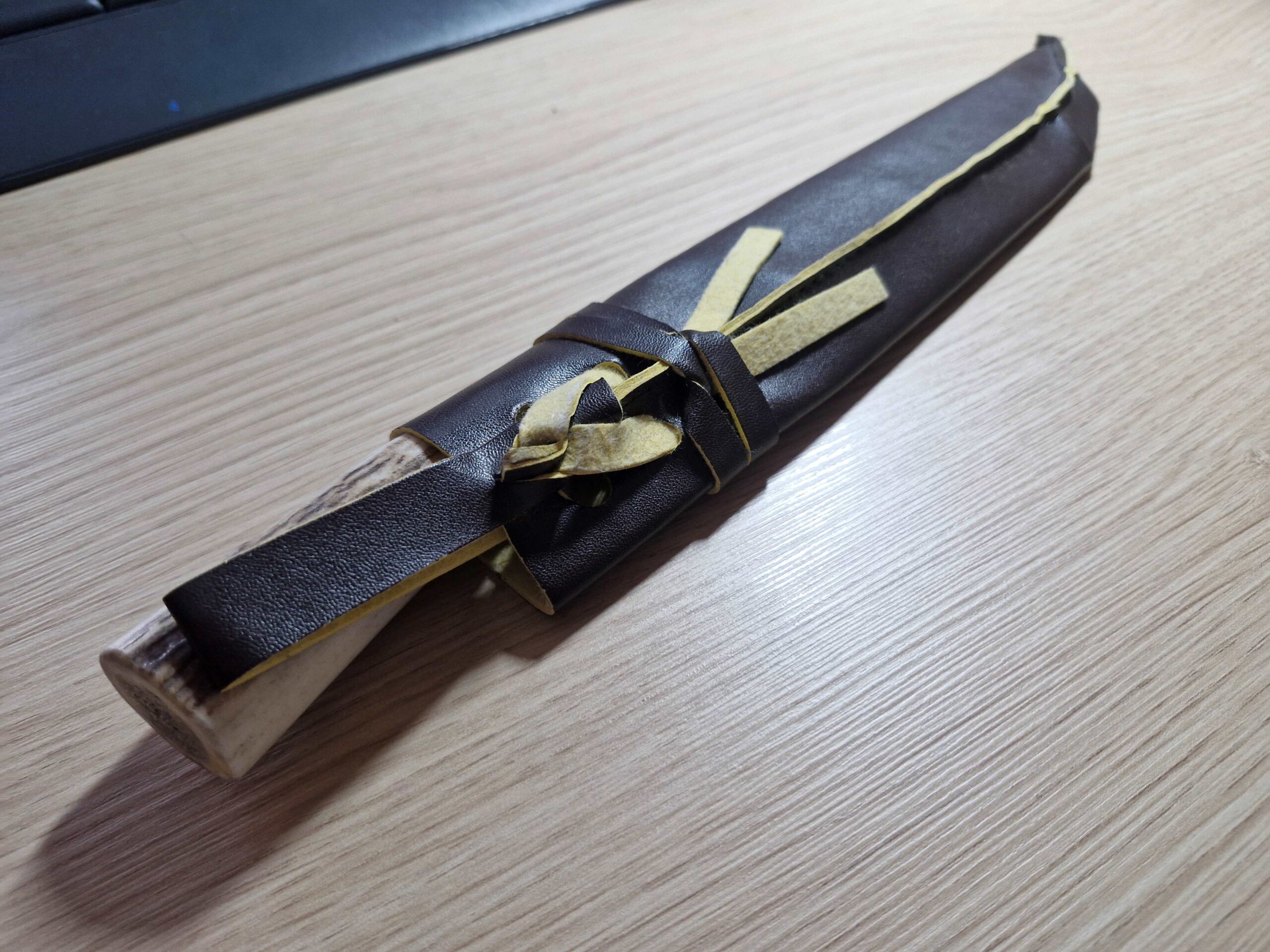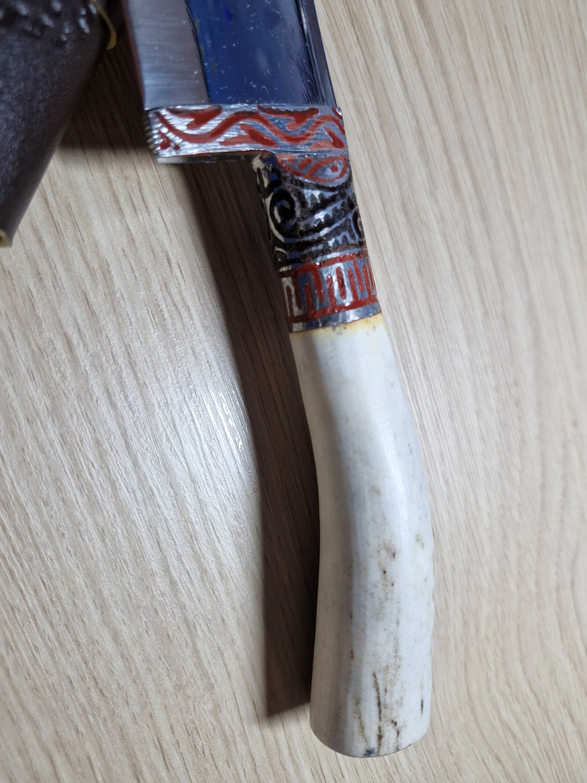 * Autentisks dizains: Rotāts ar tradicionāliem ornamentiem un komplektā ar dabīgās ādas maksti.